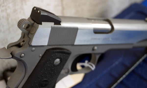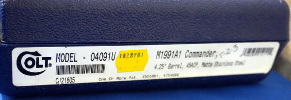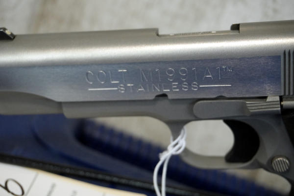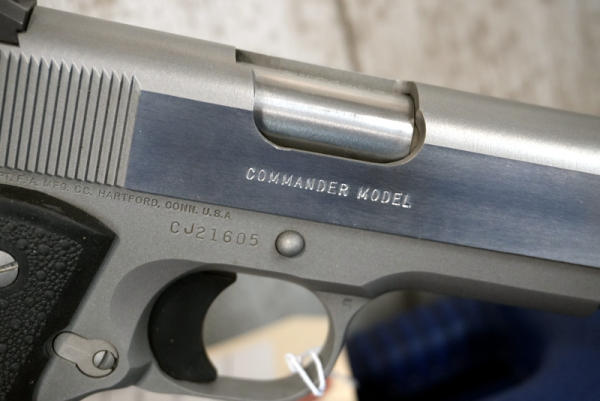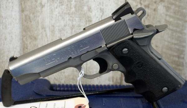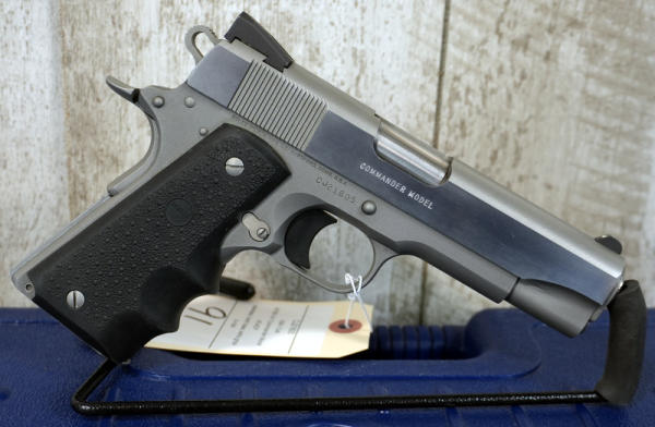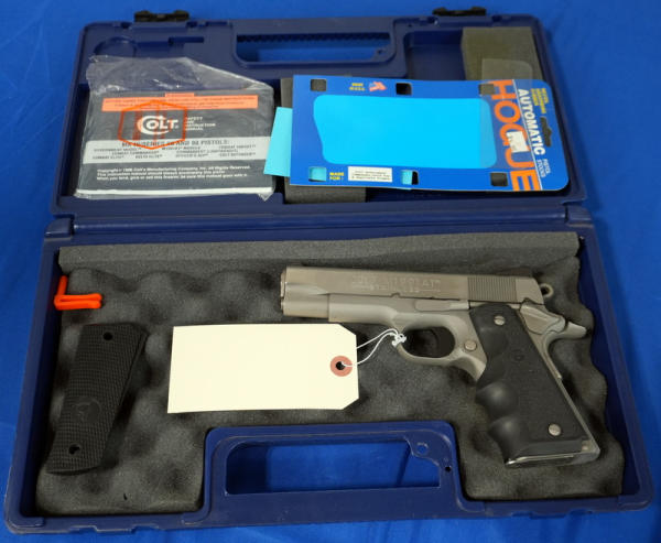 4.25" Stainless Barrel; Rubber Hogue finger groove grips; night sights; includes original rubber colt checkered grips; factory hard case; one magazine; looks mint; USA; SN#CJ21605; A-194