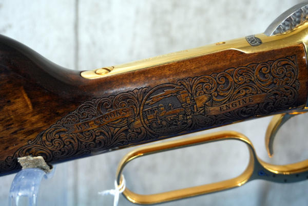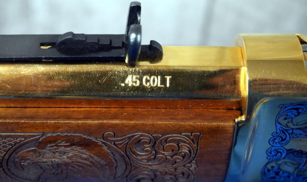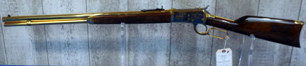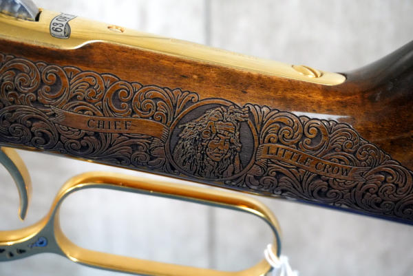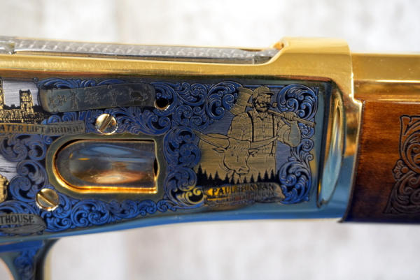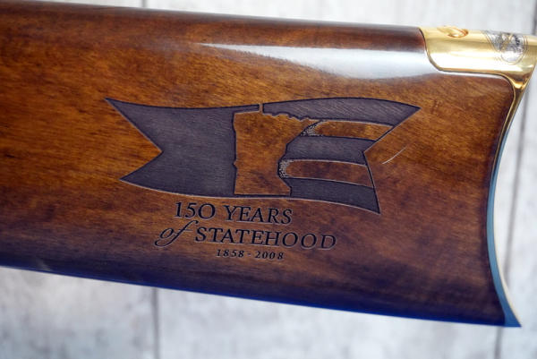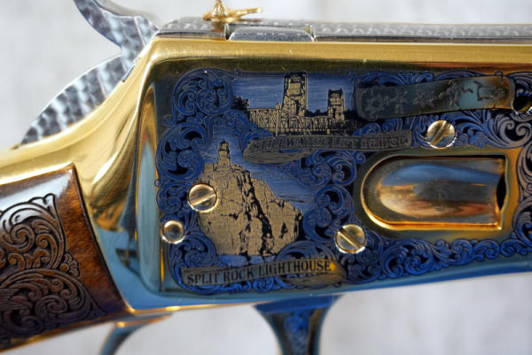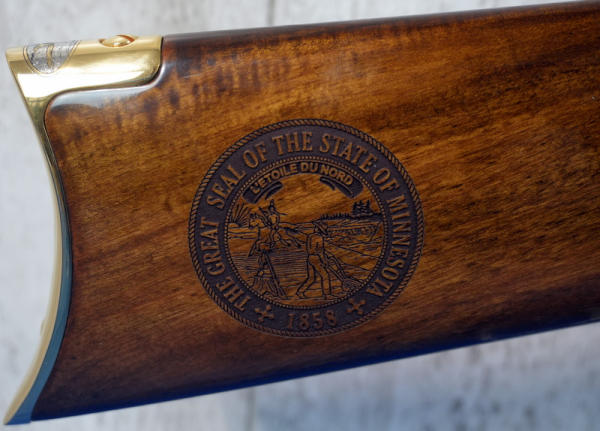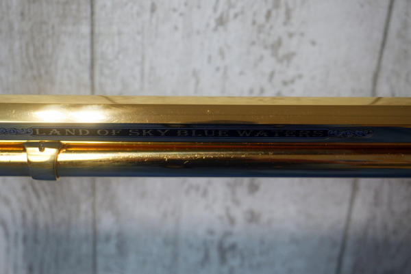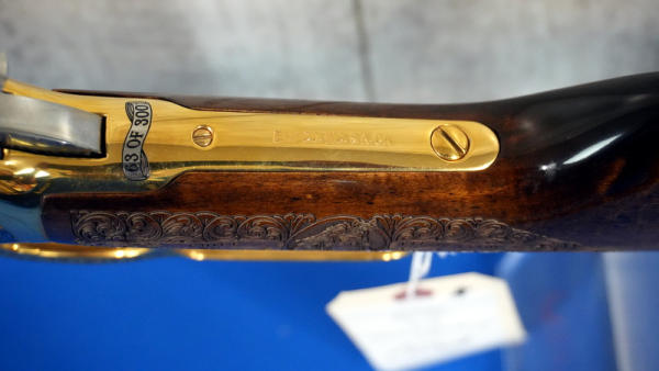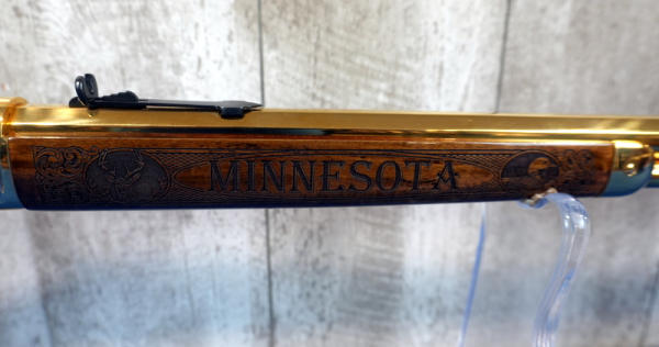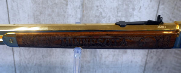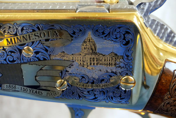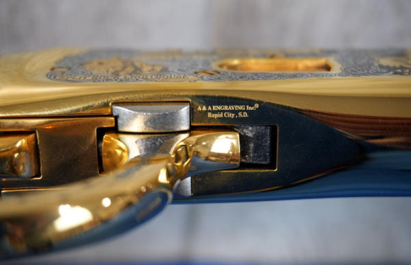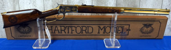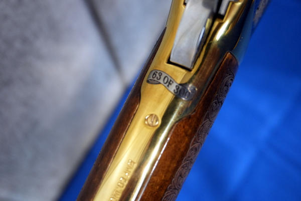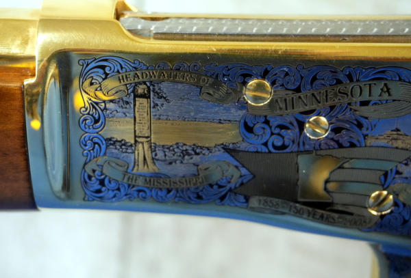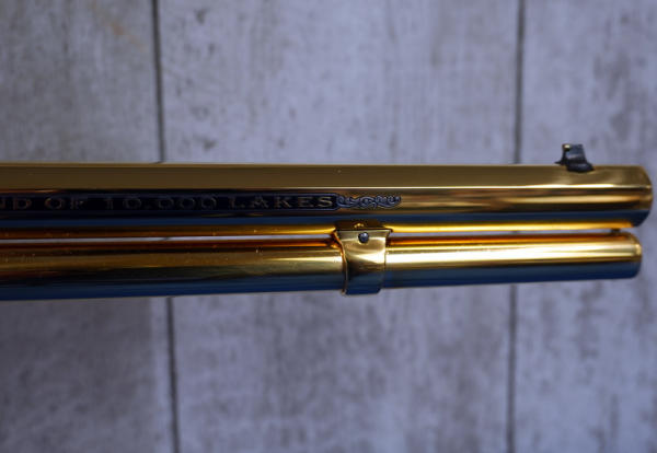 No. 63 of only 300 mfg.!; 24" Oct. Golf Finish Barrel; everything is gold plated! Jeweled hammer; highly engraved by A&A Engraving of Rapid City, SD; depicts Paul Bunyan, Lighthouse, MN Seal, Loon, Buck, Mississippi River, Capital Building, Chief Little Crow, Bald Eagle, Bear & More!; original box; mint & unfired; another beauty!; Brazil; SN#SS094553; A-196