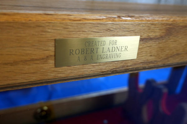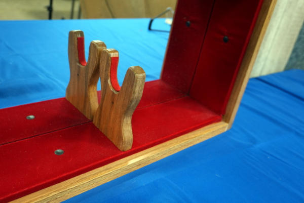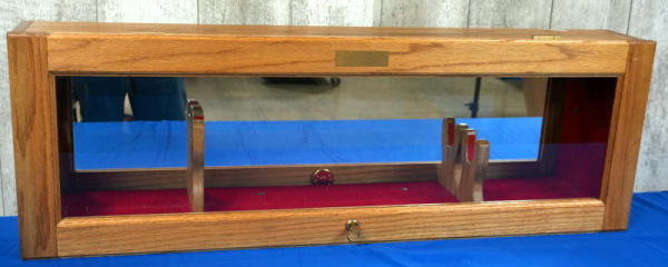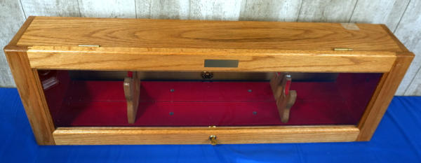 42.5"L x 14" T x 6.5" W; max gun length is 39.5" long; red felt inside, glass front; mirrored back; lights up and locks; has key; great to display one of these customs just sold! Has an emblem on the front marked "Created For - Robert Ladner" A&A Engraving"; NO SHIPPING, local pickup only