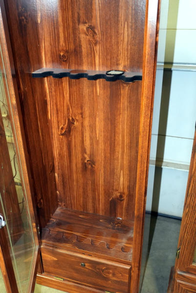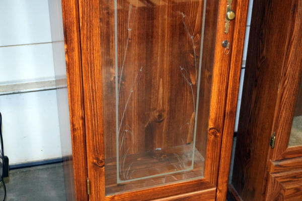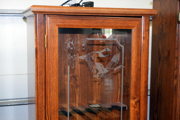 has Canadian Geese graphic on glass; bottom storage; key works; 66"x24"x13"; lights; NO SHIPPING, local pickup only