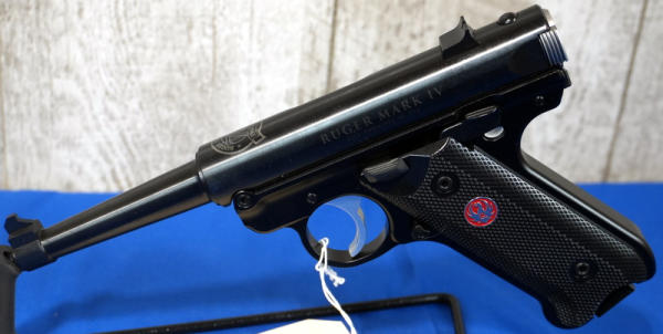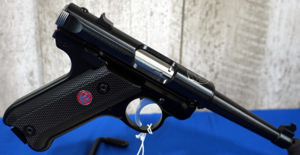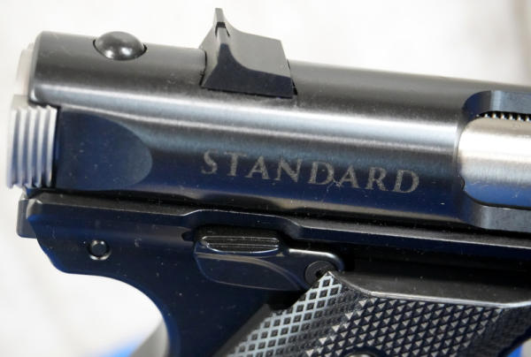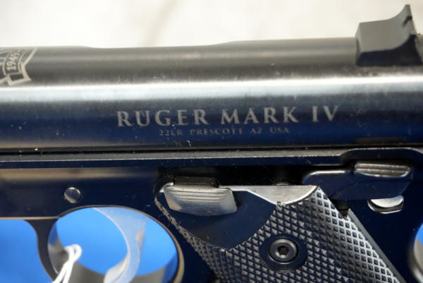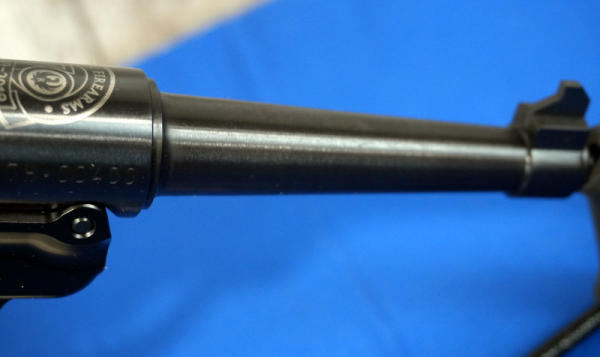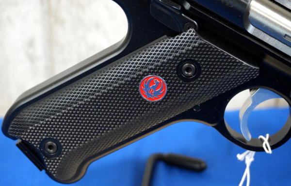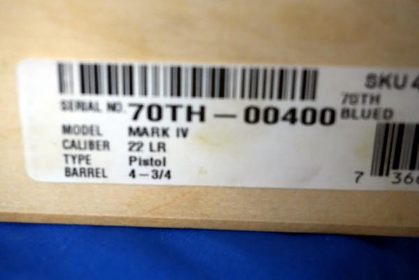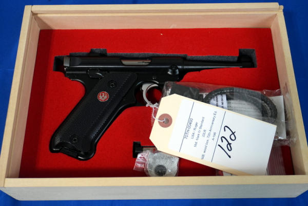 4.75" Tapered BBL; black checkered plastic grips w/red eagle logo; has factory wood box w/cardboard sleeve; 2-magazines; mint & unfired; USA; SN#70TH-00400; A-196