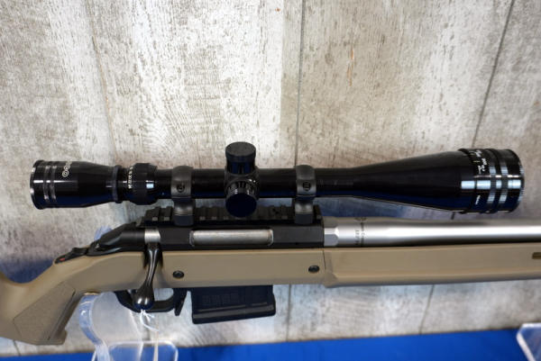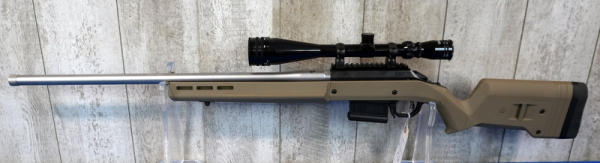 like new; 26" Stainless Threaded Savage Pre-Fit Barrel; 2-magazines; Hunter American Magpul light brown synthetic stock; Japanese made Tasco 6-24x44 nice scope; USA: SN#691526260; A-201