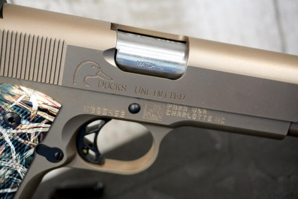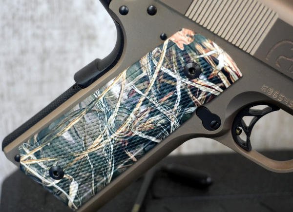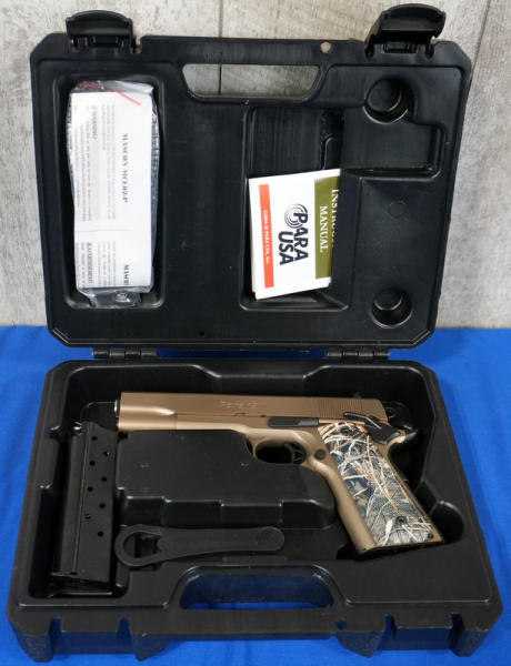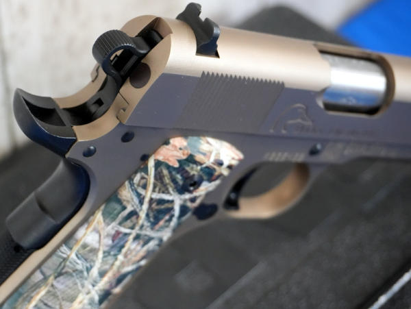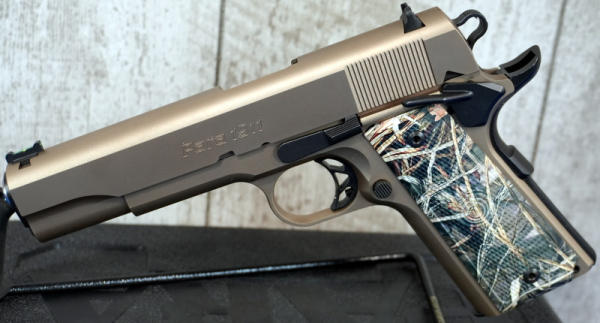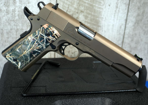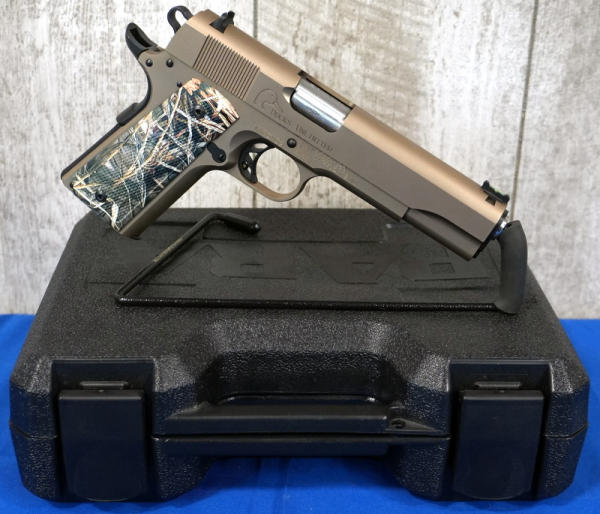5" stainless barrel; Mint & unfired; beautiful bronze finish; checkered synthetic camo grips; hy-vis front sight; two-magazines; factory hard case & papers; one of the best looking 1911's out there! USA; SN#K065453; A-60