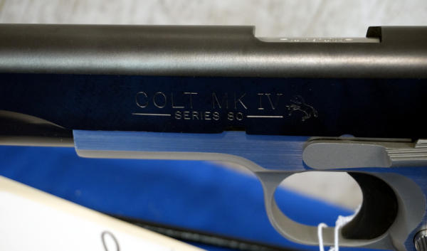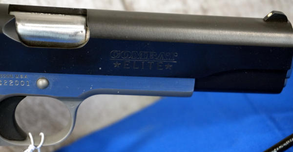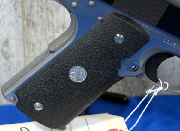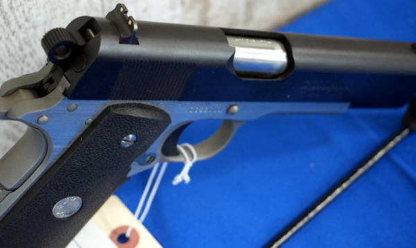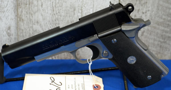 5" Stainless barrel; rubber Colt wrap around grips; night sights; stainless frame w/blued slide; very nice used condition; USA; SN#CG22001; A-194