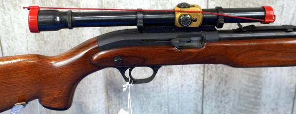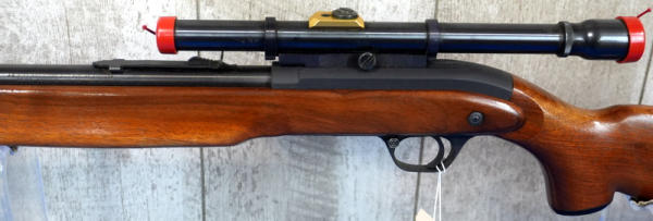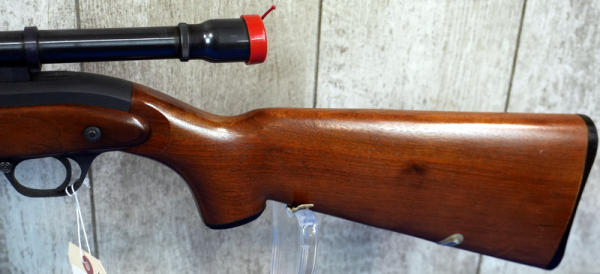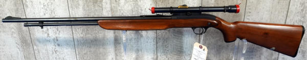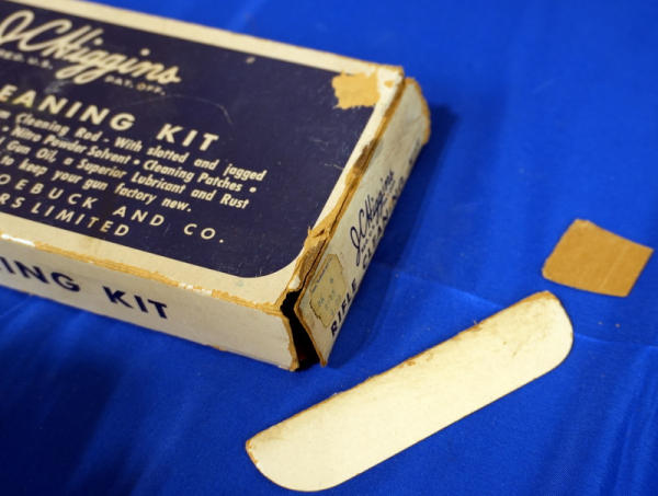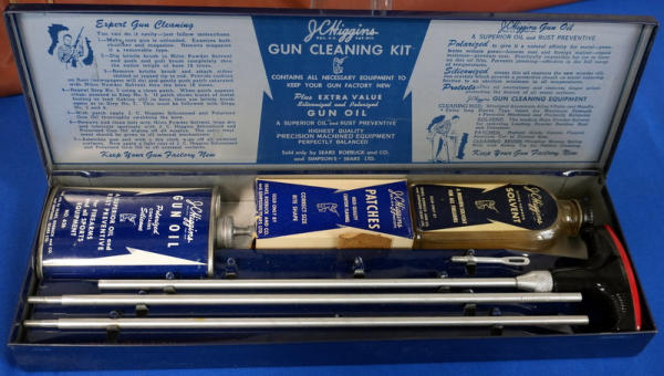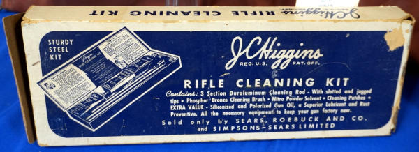 24" BBL; very nice wood; looks like gun was hardly shot; has retractable sling built into stock; includes JC Higgins Rifleman 4x Scope w/Brass block; original J.C. Higgins zippered vinyl case and a NOS J.C. Higgins cleaning kit w/original box! Great looking set all displayed together; sells as a family; this would have all been originally sold through Sears; USA; No SN#; A-207