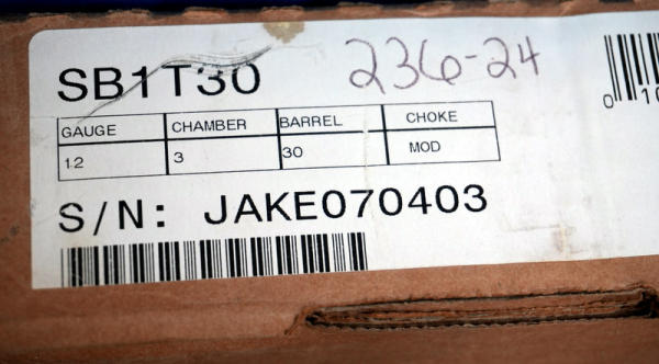 30" VR-BBL; wood grain laminate stock w/NTWF logo; stainless receiver; factory box; looks new & unfired; hy-vis front sight; 3"; screw-in choke; USA; SN#JAKE070403; A-214