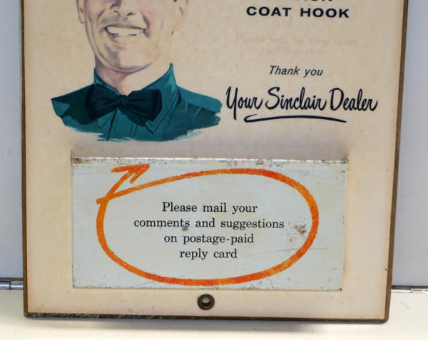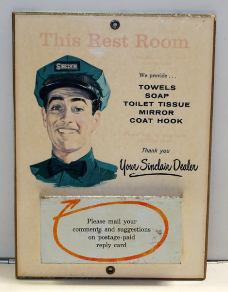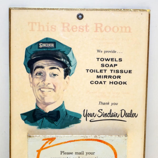 11"x8", masonite w/ tin card holder, colors are faded and has some wear, hard to find Sinclair piece