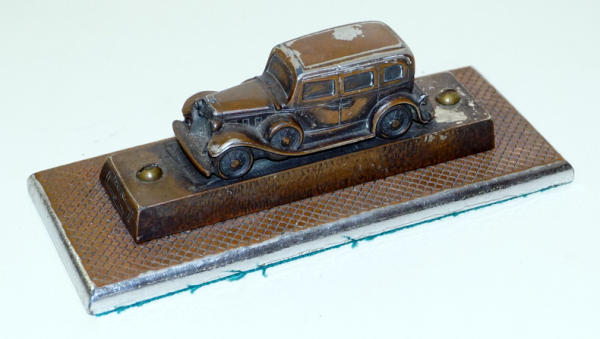 6" long, car is 3" long, very heavy, some light wear to the finish, looks to be a late 1920's or early 30's car