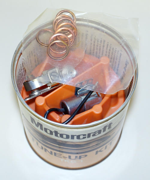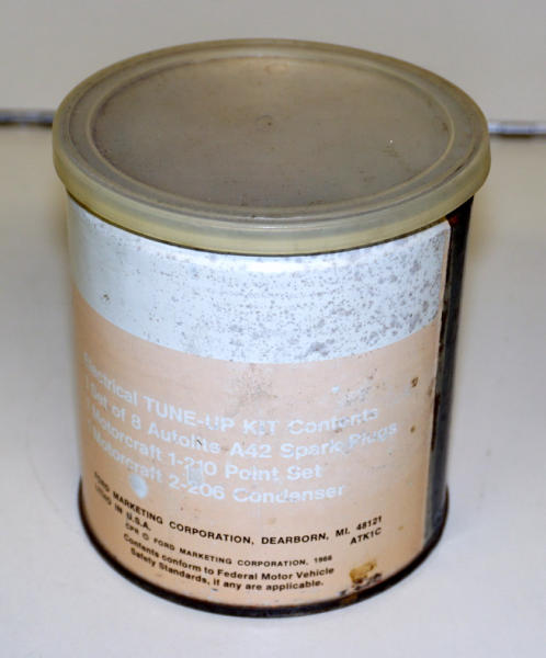 4.5" tall metal can with plastic lid, has a new rotor cap, points and small ignition parts inside, some fading to the can