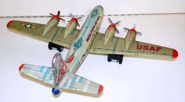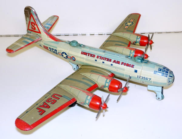 15" long, 20" wingspan, some discoloration on the wings, some paint loss on the tailfin, overall a good looking antique toy
