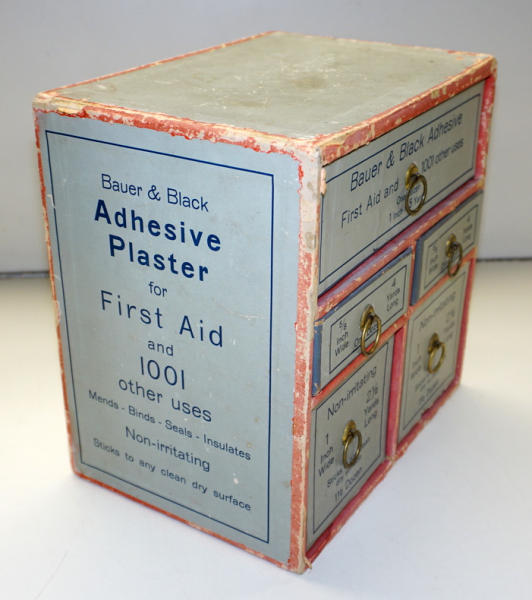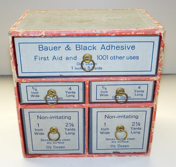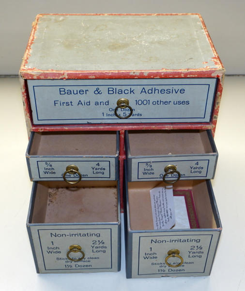 10"x10"x7", heavy cardboard with paper front, great graphics, some general wear and fading