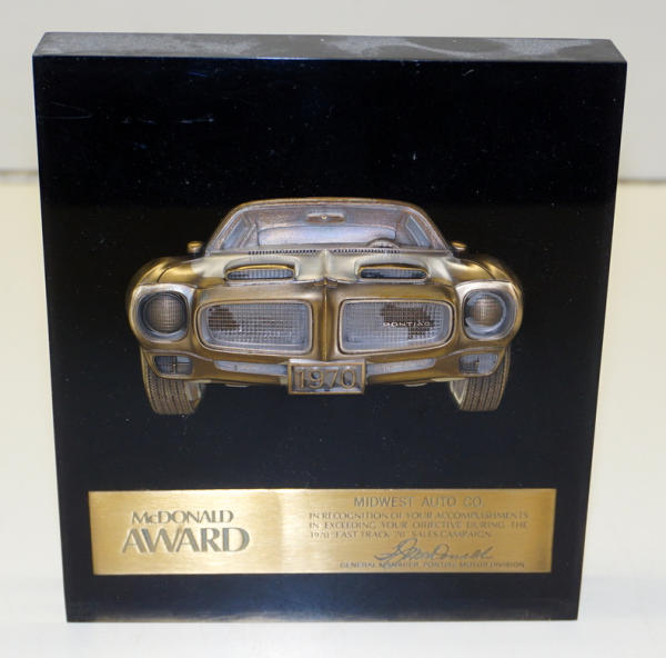 7"x6"x1", heavy acrylic with brass Pontiac GTO in the center, award from the "Fast Track '70" program, light scuffs, nice piece