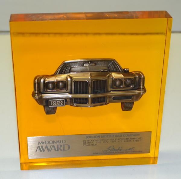 7"x6"x1", heavy acrylic with brass car in the center, awarded from the 172 Spring Sales Spree Campaign