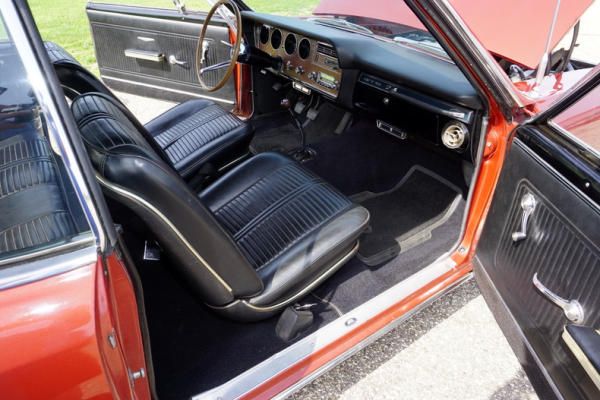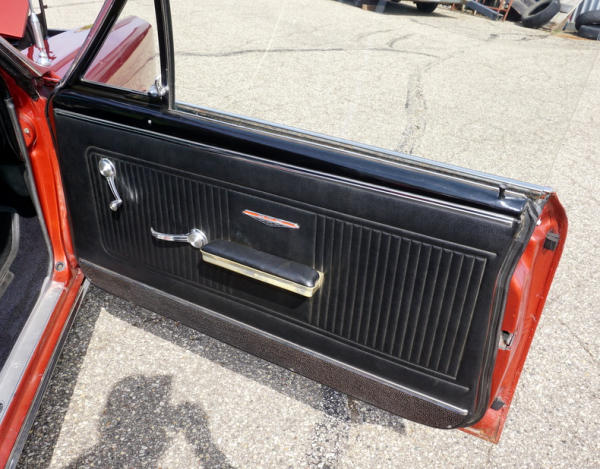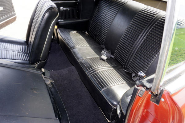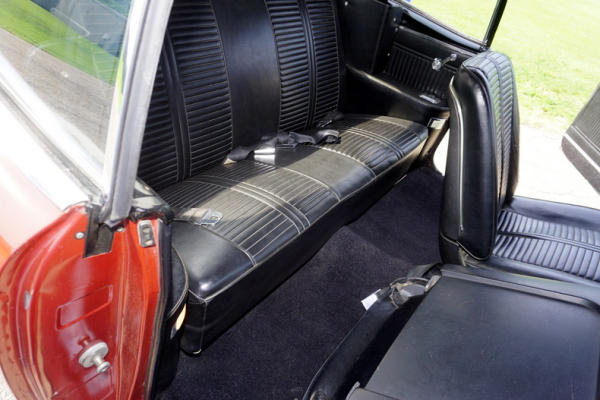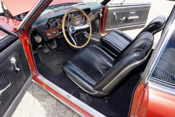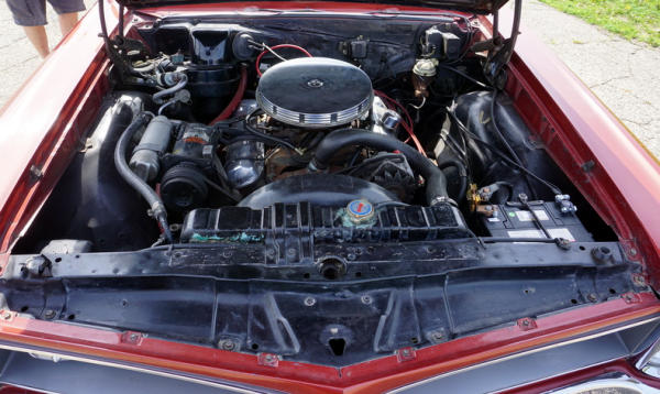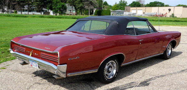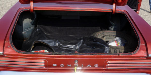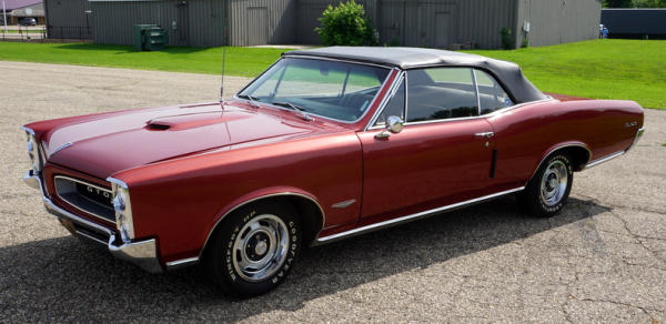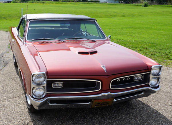 389/4spd, power steering, power brakes, factory A/C, good original top & original interior, Marv is the 2nd owner, sold new in Omaha, special order paint, paint code is "0"; it is the 1966 Cadillac "Fire mist Red" color and the only one known to be painted that color from the factory; this has been verified by the Pontiac Collector's Club.