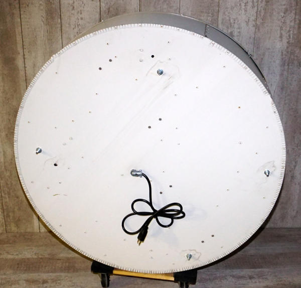 42" across, 11" thick can, plastic face with original metal can, lights up and works good