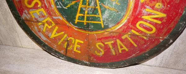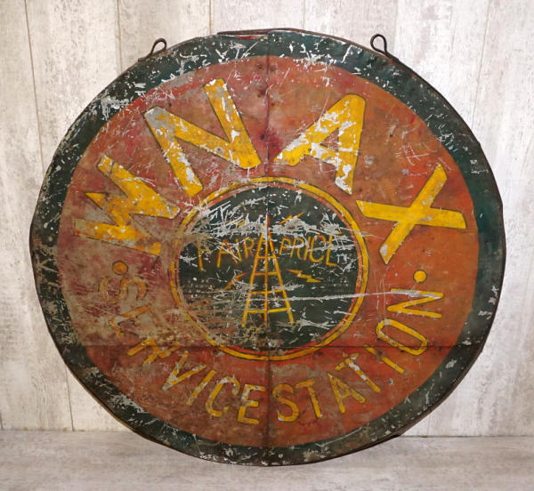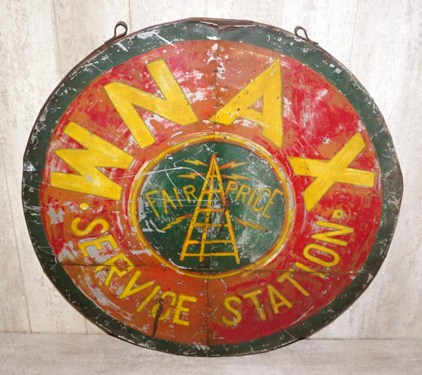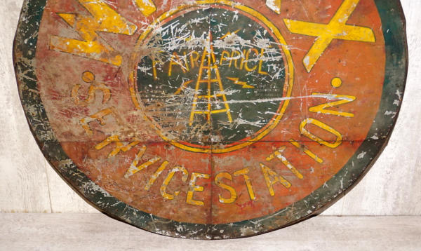 39.5" across, wood center, each side is multi pieces of tin, I don't think it was ever cut, but made this way, really early paint, definitely has wear and patina, but a South Dakota related sign we have never seen or sold before
