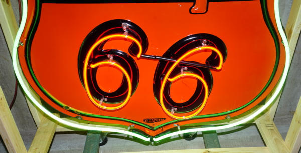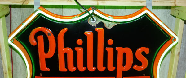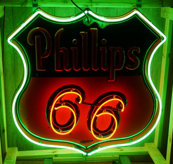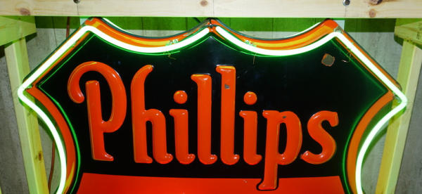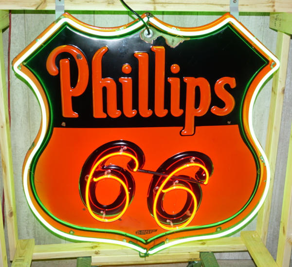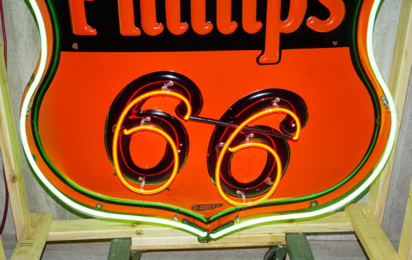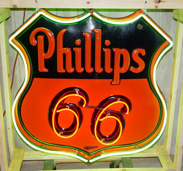 52"x52", made by Federal Sign Co, brand new neon and transformer, one side has a chip in the top right corner and a few edge chips, rates 8.5 condition; reverse side rates 8 condition with some larger chips in the top center and a few small scattered chips; in a crate and ready to transport home