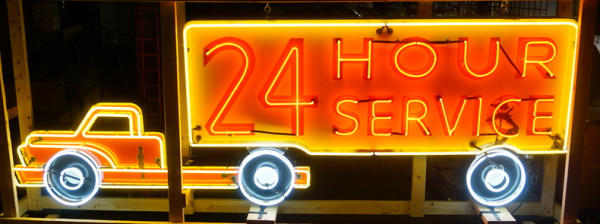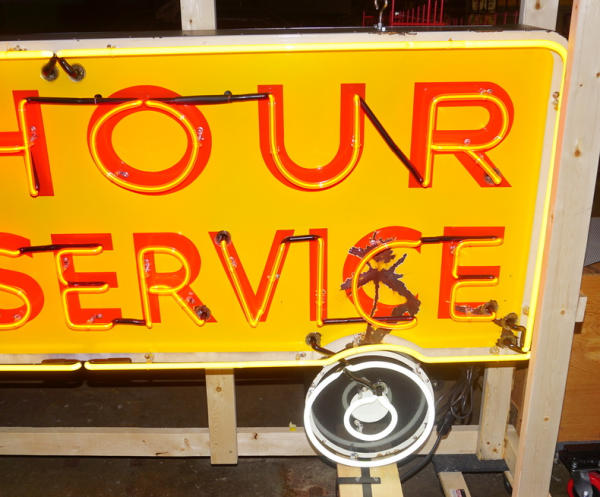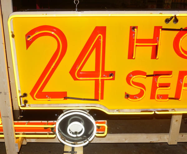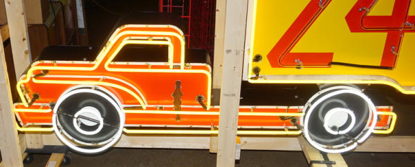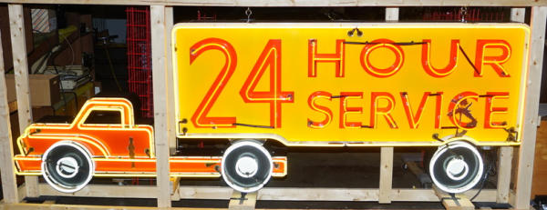 11.5' Long, about 4' tall, originally found at a Shell Truck stop outside of Chicago, there is some damage to the porcelain on the right bottom corner and some chips on the truck door, all crated & ready to move, a center piece for the truck collection!