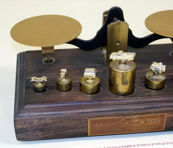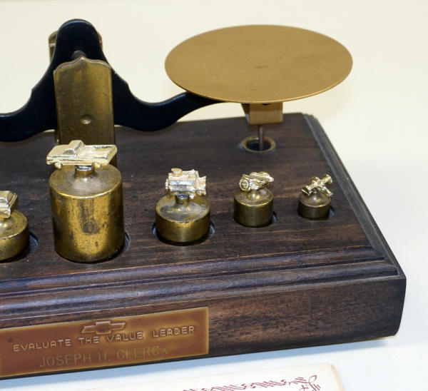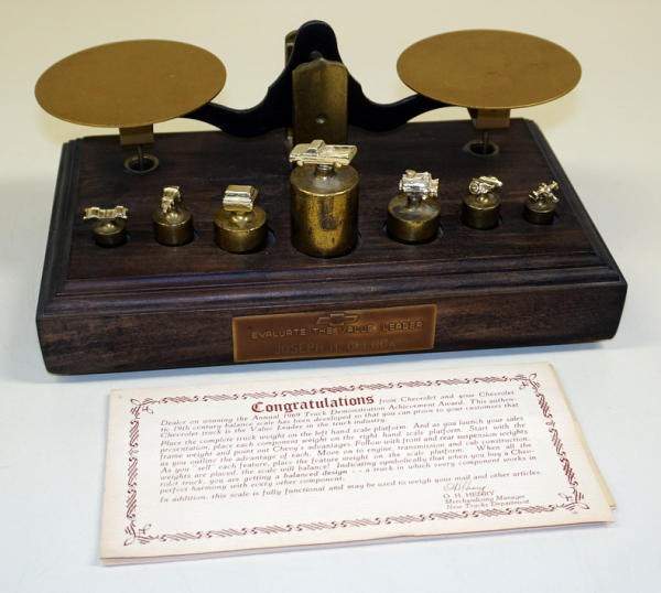 10" long, has all the correct weights, wood base w/ brass, nice dealer award