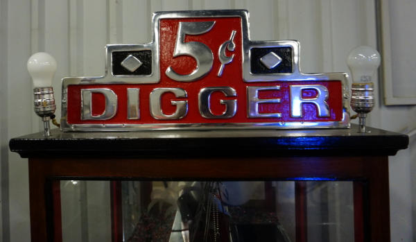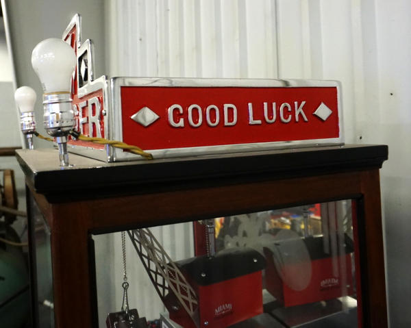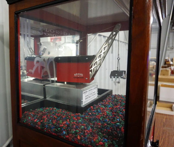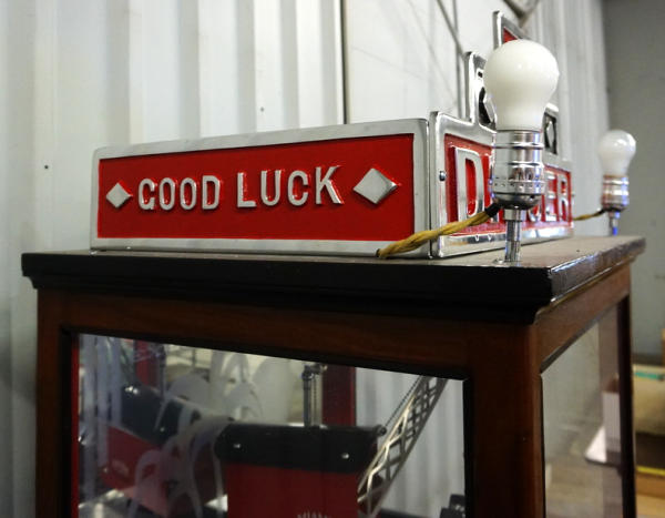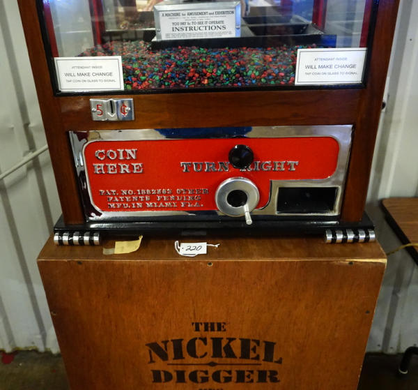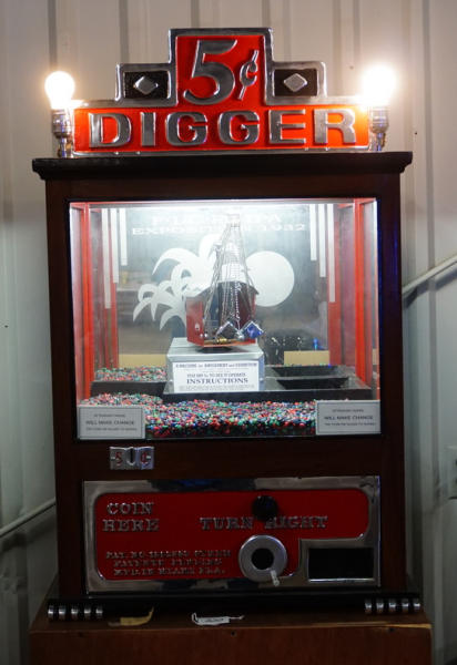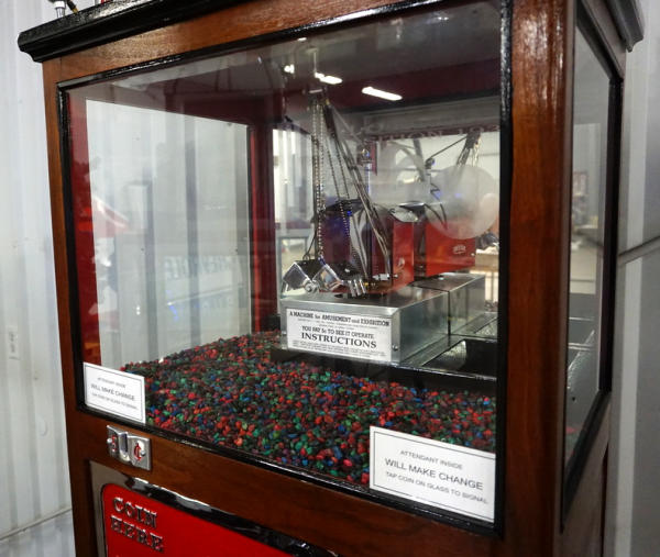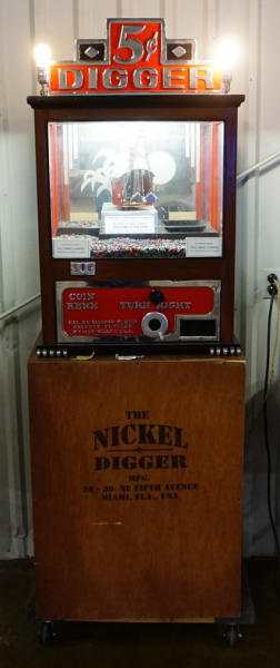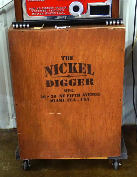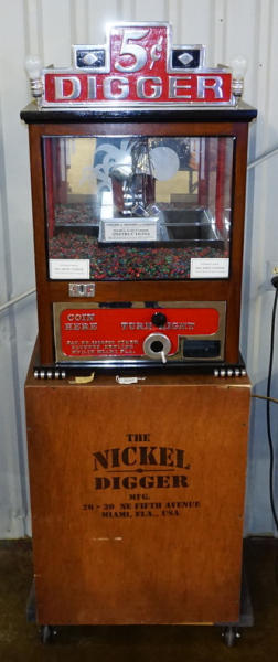 base is 24"x19", machine is about 40" tall plus the shipping crate; this is a fairly modern made machine, professionally built and very high quality, designed to look like one from the 1930's, beautiful piece and was told it works like it should; no shipping