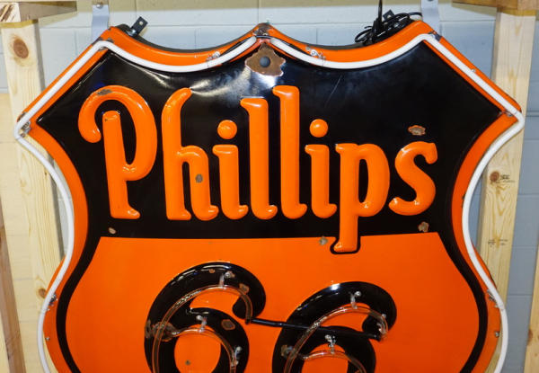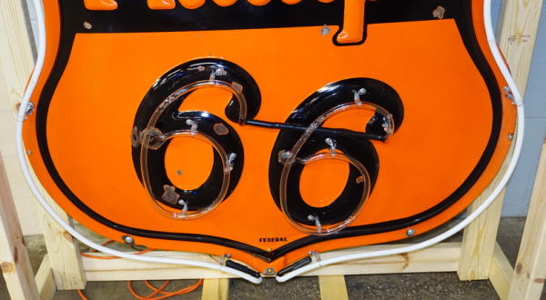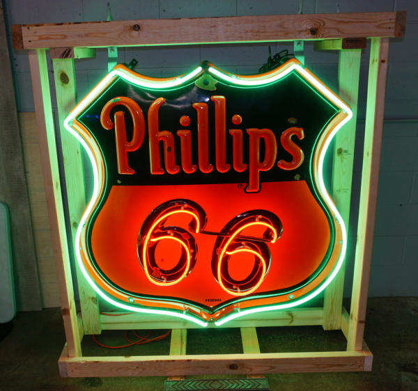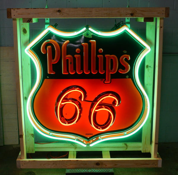 48"x48", marked "Federal", all new can, neon tubing & transformer, face has some chips and wear, but overall good condition, rates 8 condition; in a crate and ready to take home; no shipping, pickup in Worthington, MN only