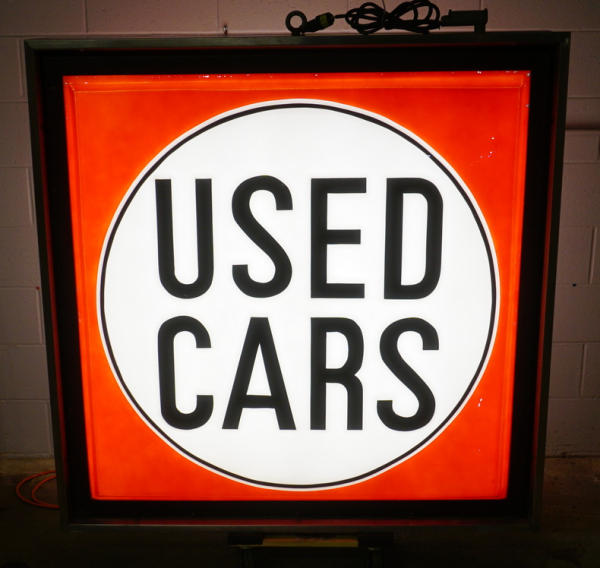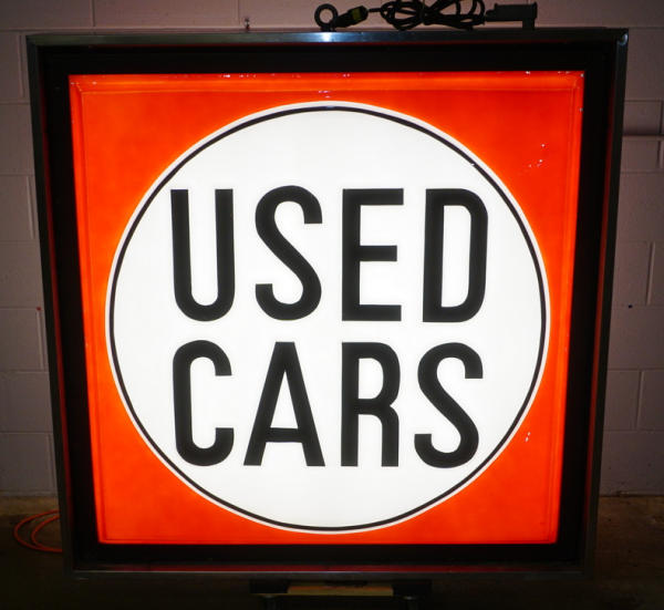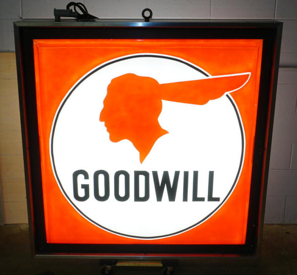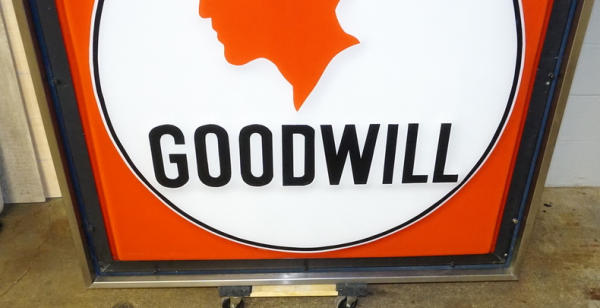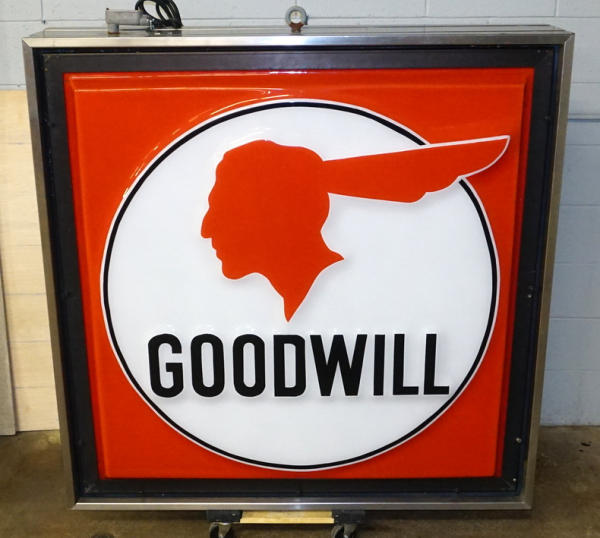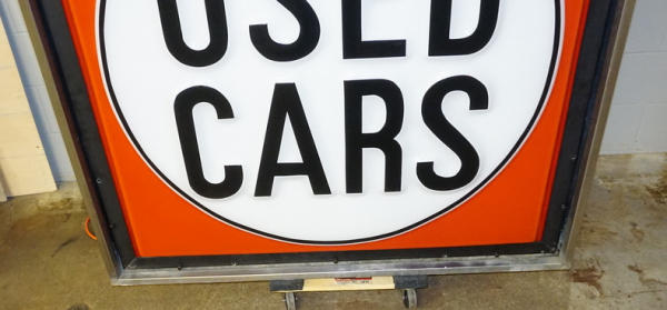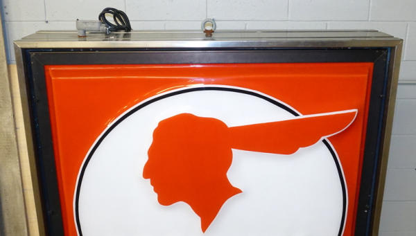 53"x53", embossed plastic faces are both good, I don't see any major damage, just some aging, in a really nice stainless steel can, new wiring and lights up A-1, no shipping, pickup in Worthington, MN only