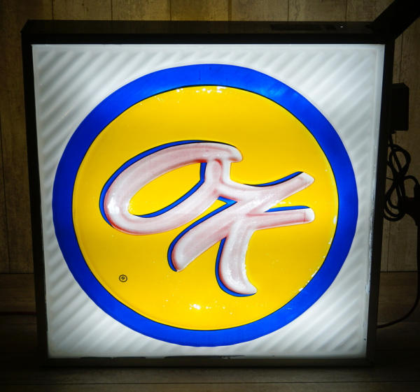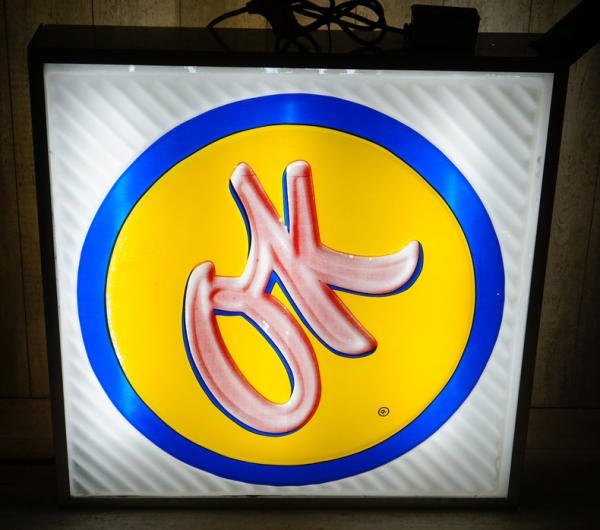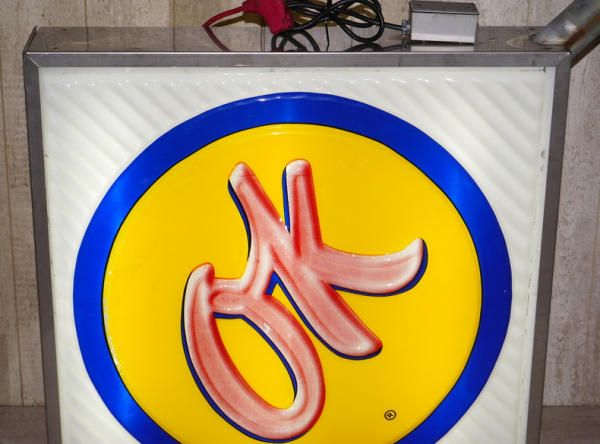 Signs are each 36"x36", both have some fading and small scratches, stainless steel can and partial mounting pole, faces are embossed, very bright when lighted and looks great