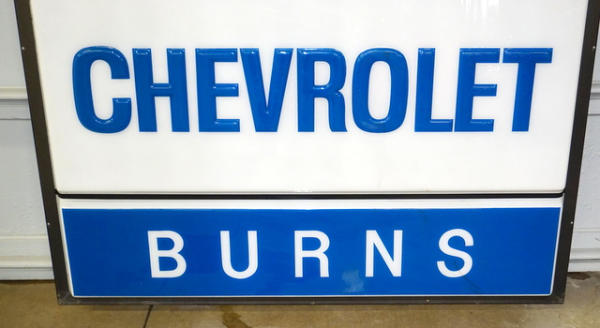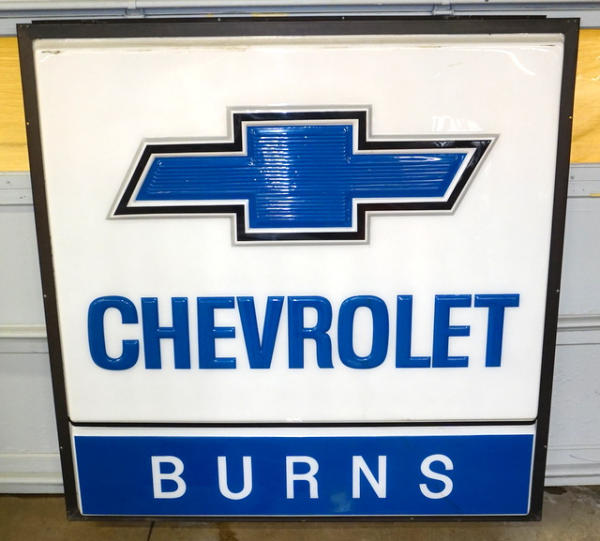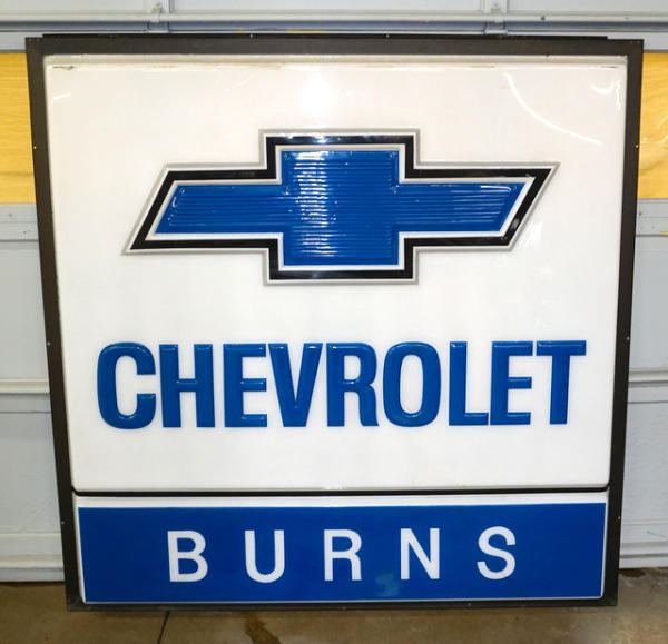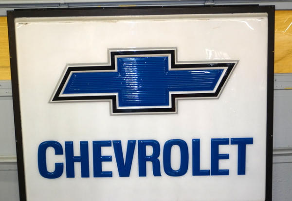 6'x6', clean and nice, has a small crack on one side, logo and Chevrolet are embossed, metal frame, no electrical included; pickup in Worthington, MN only