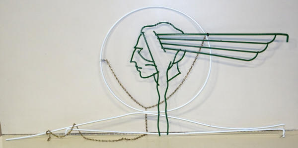 42" long, 19" tall, was used as part of a weathervane on top of a dealership, has been repainted, chains were added to hang it up