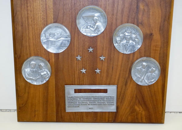 20"x16", heavy walnut plaque with pewter medallions
