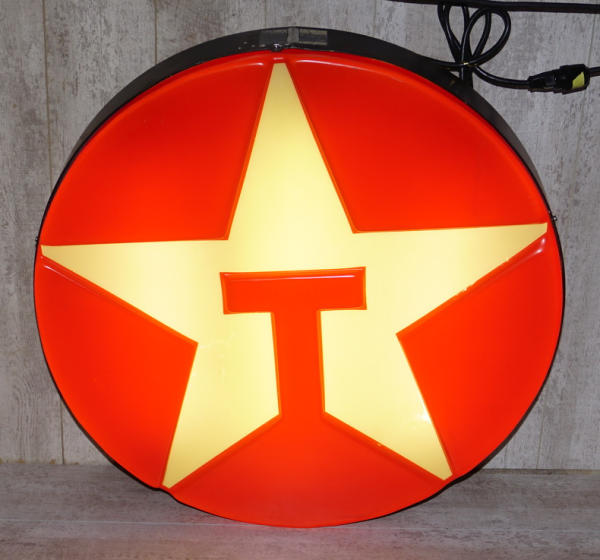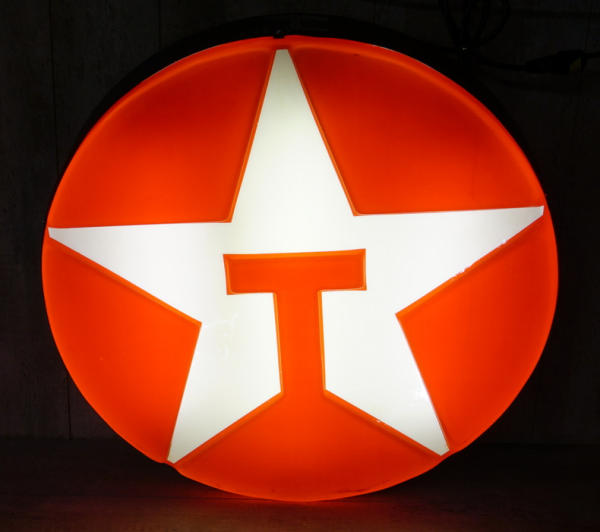 34" across, embossed plastic, lights up and works good