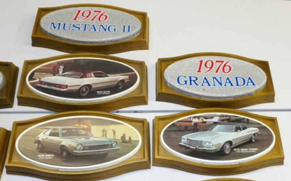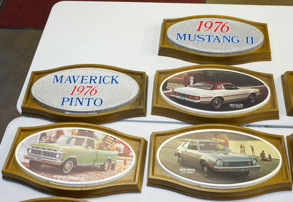 each is 12"x22", lightweight plastic, all clean and near mint, looks like they were never used, includes the Ford Pickup, Thunderbird, and Pinto, sells as a set; found here at the Ford Dealership in Worthington