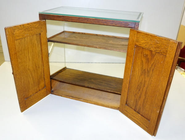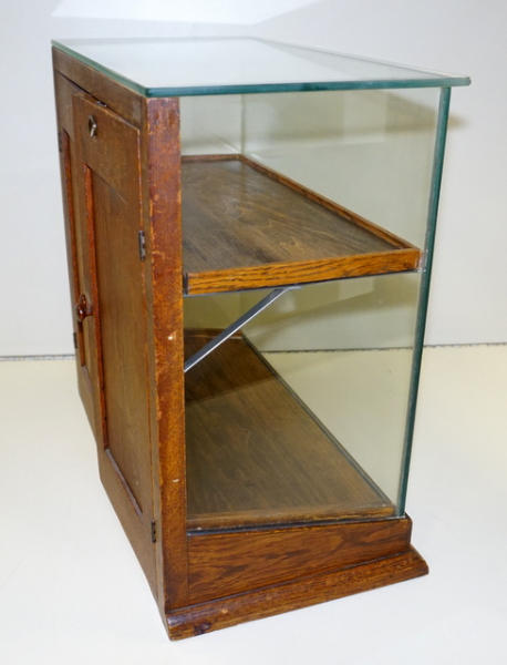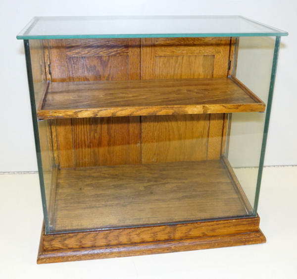 16"x16"x9" deep, slanted wood bottom, excellent condition