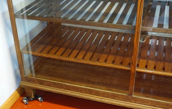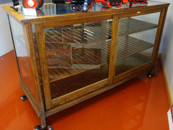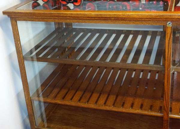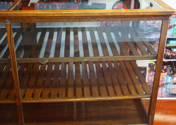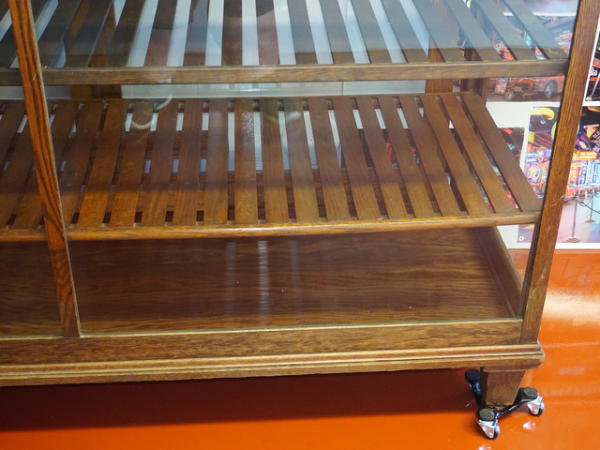 6' long, 41" tall, 26" deep, 2 large slotted wood shelves, probably out of a cigar store, nice condition, pickup in Worthington, MN only