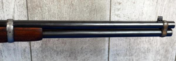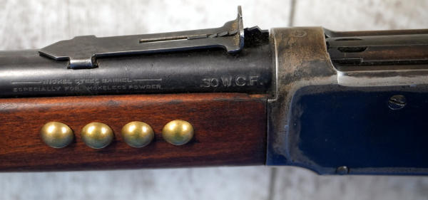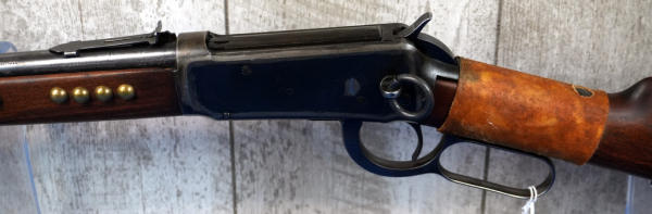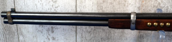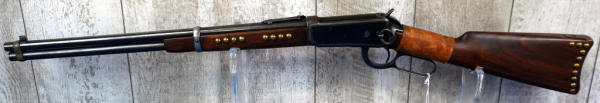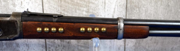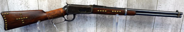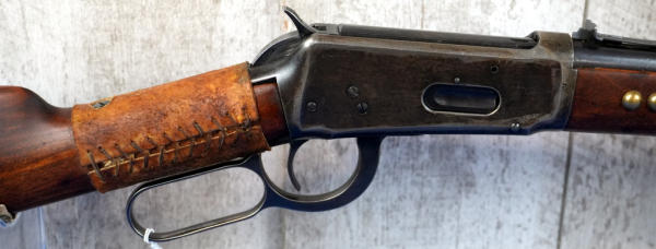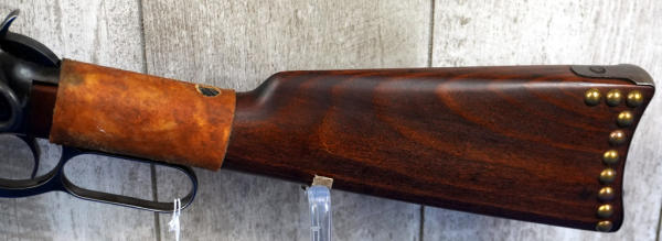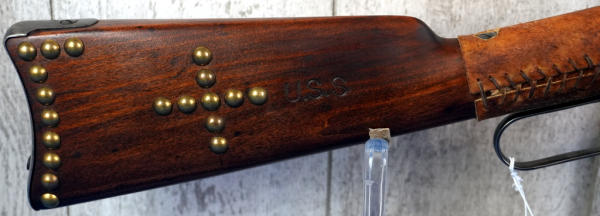 20" Rnd. BBL; action is stiff and clunky; careful when levering as will catch and can pinch fingers; rawhide leather is covering cracks behind receiver; receiver has bluing loss; brass tacks added & stamped U.S.S. on stock; saddle ring; USA; SN#760495; A-192