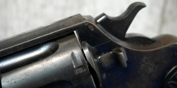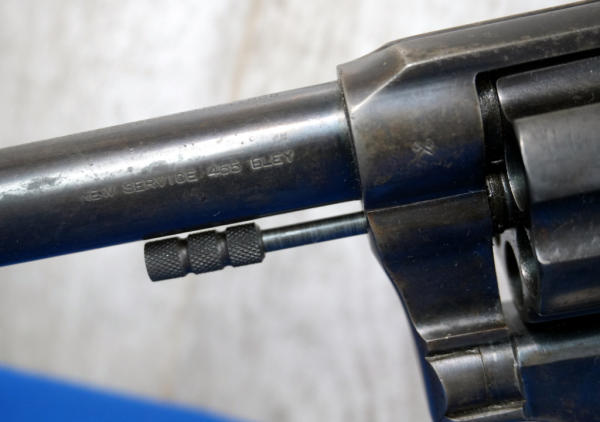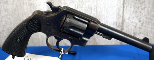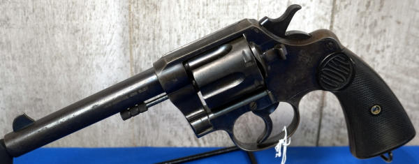 5.5" BBL; factory checkered plastic grips; 6-shot swing out cylinder; bluing is dull; check pics of proof marks; USA; SN#100396; A-192