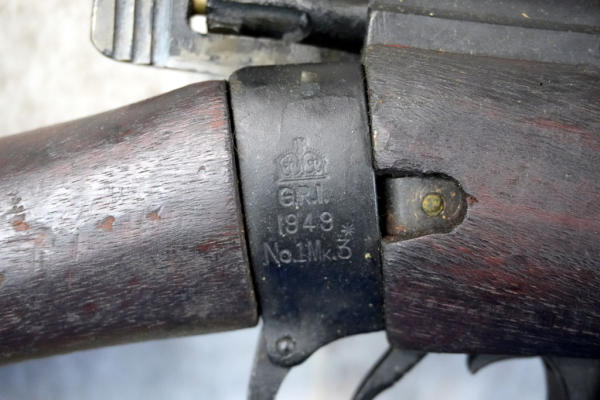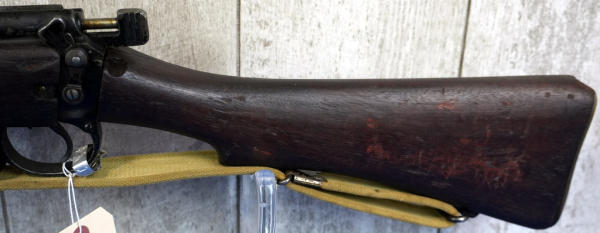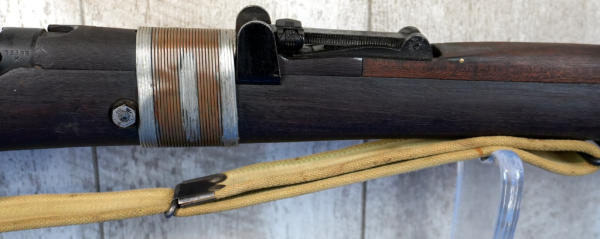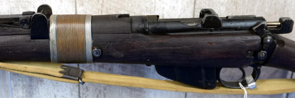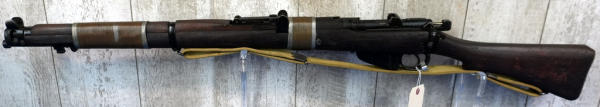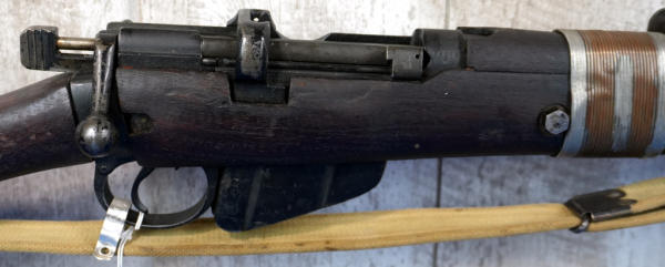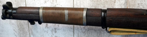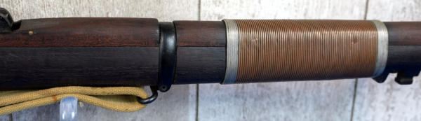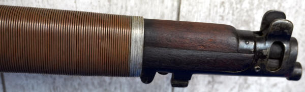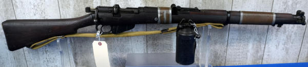 25" BBL; wire wrapped forearm, khahi sling; wood has normal use wear; removable magazine; dated 1949; launcher is marked S&B and is 6.5" long; Great Britain; SN#55686; A-192