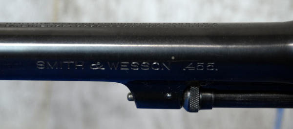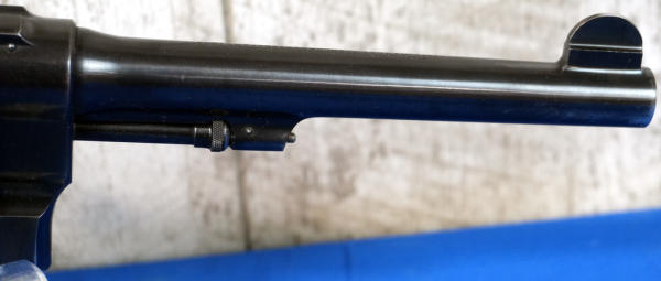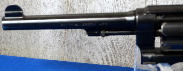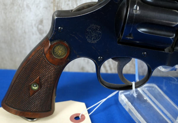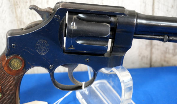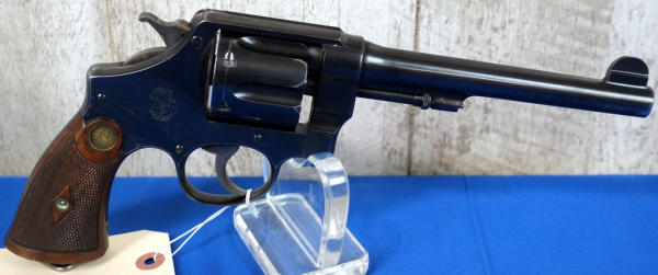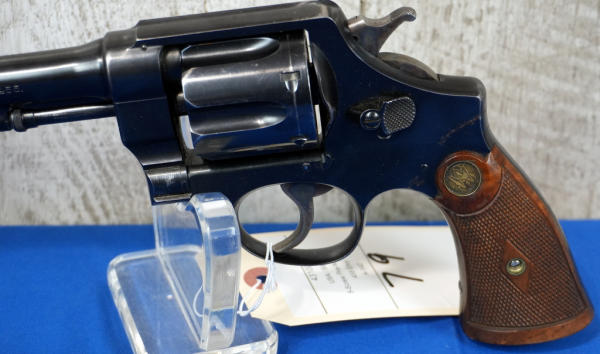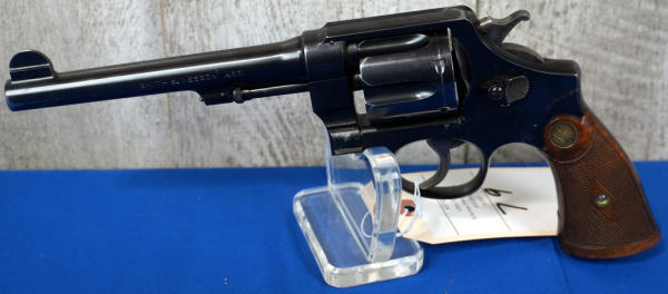 6.5" BBL; UK broad arrow crudely inscribed on bottom of the civilian style medallion wood checkered grips, lanyard loop; bluing has a few scratches mainly on the main frame by cylinder; 6-shot swing out cylinder; USA; SN#43100; A-192