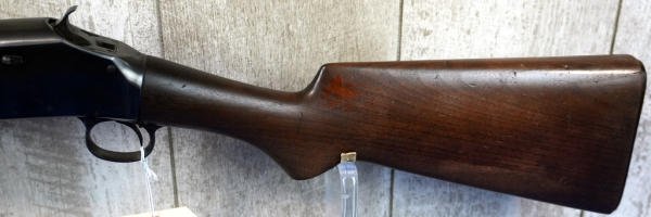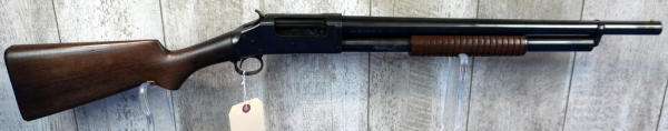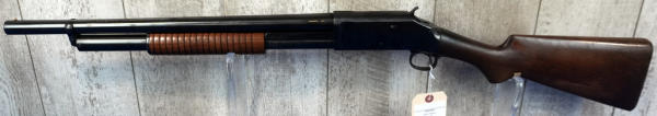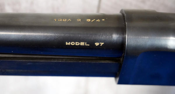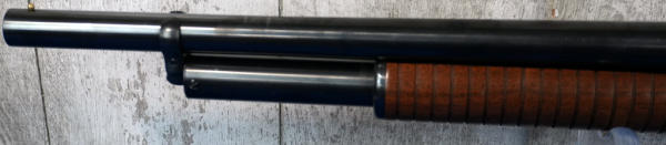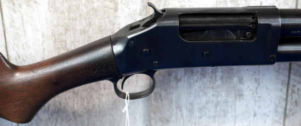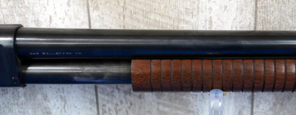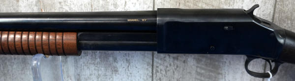 Chinese copy of a Winchester model 97 riot gun, imported by IAC of Billerica, MA. 20" full choke barrel on a solid frame receiver. Original bluing is still mostly excellent, aside from the bottom of the mag tube from cycling. Some gold filling done on some of the engraving. Original pump handle, with a good Winchester high and sharp comb stock; Winchester hard rubber buttplate; 2.75"; CC; China; SN#CB00269; A-192