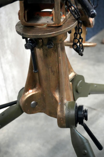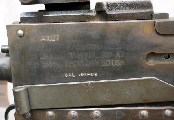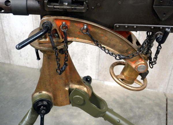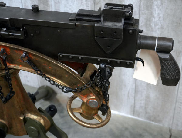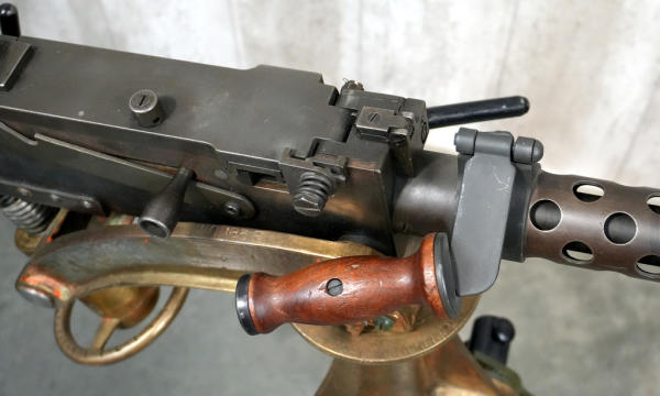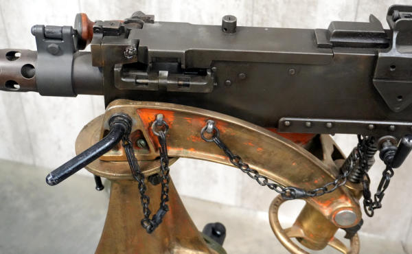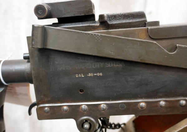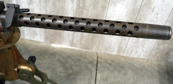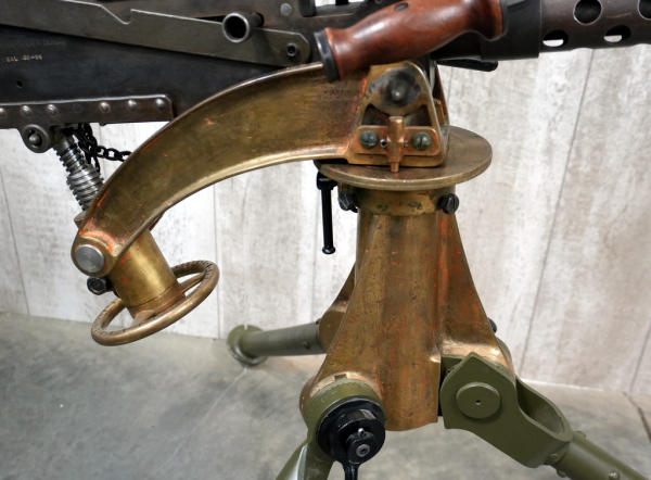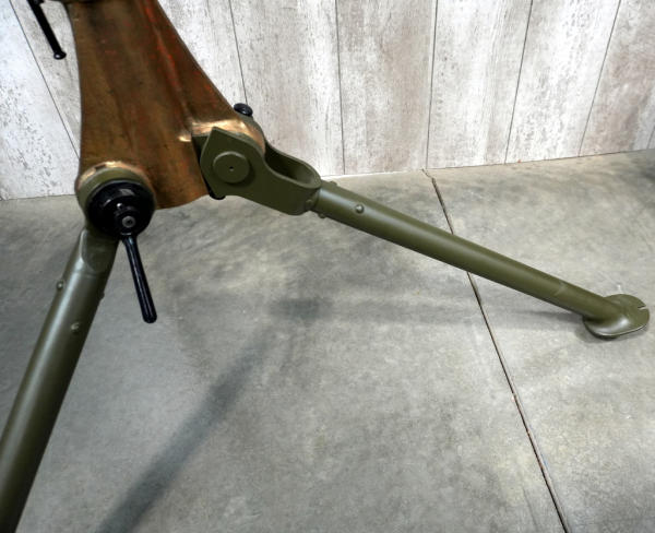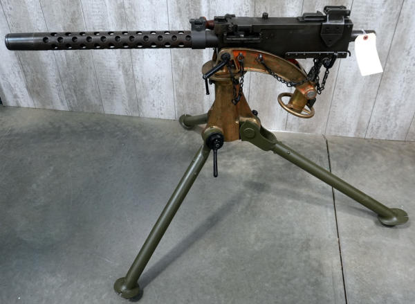 Fitted with a semi-auto side plate, steel pistol grip, w/ restored M1917 tripod with Aniston Arsenal rebuild date of 1937, bare brass hub, with T&E; 24" BBL w/heat shield; very unique look w/the brass; very heavy, prefer local pickup due to size and weight; would have to ship in two separate boxes if needing shipped; check pics for details; SN#A1027; A-192