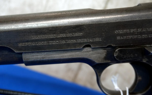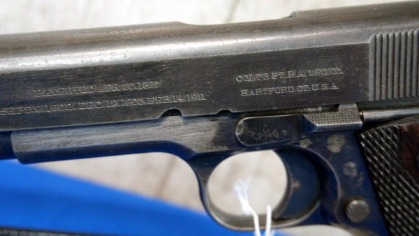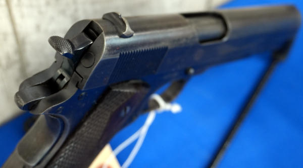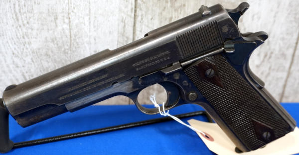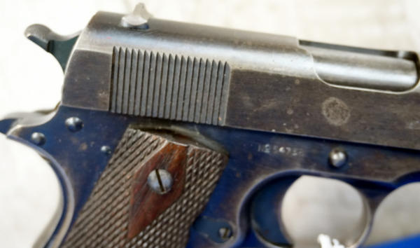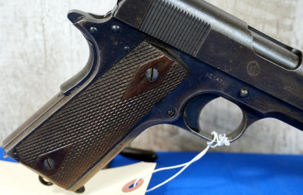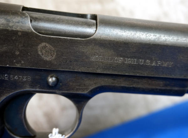 5" BBL; Repro 2-tone mag, US PROPERTY removed below the slide on left side; has some bluing loss & spotting; wood checkered grips; USA; SN#54738; A-192