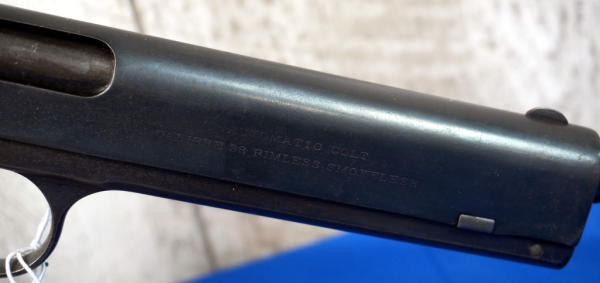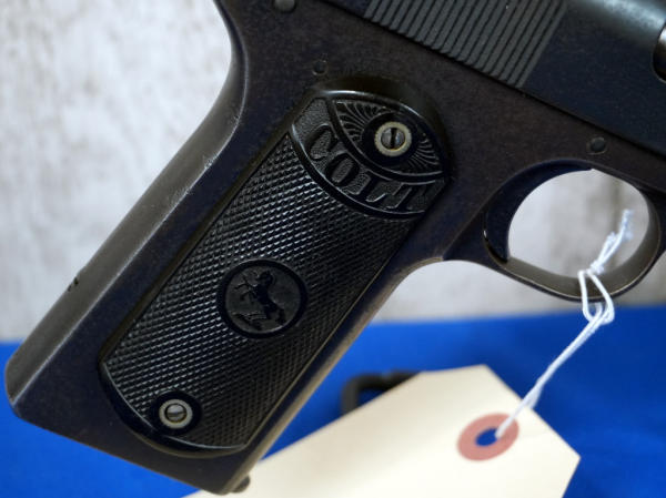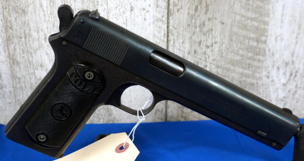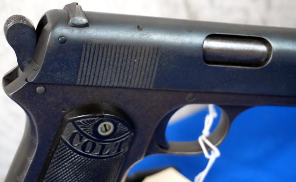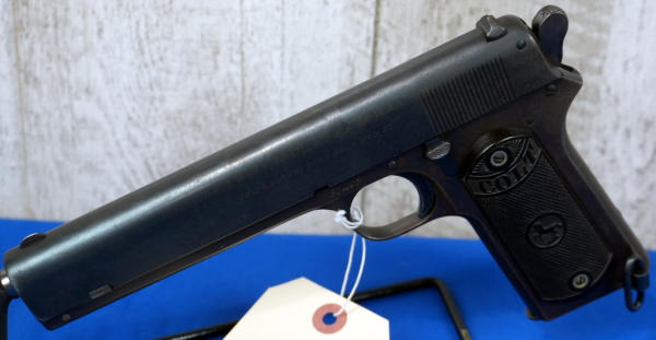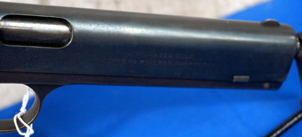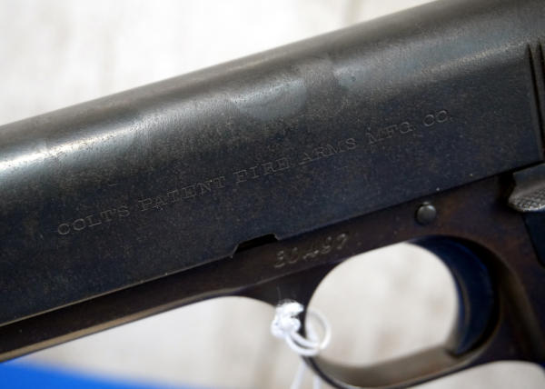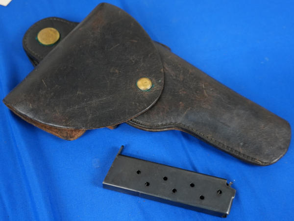 5-7/8" BBL; Lanyard loop, reblued over worn finish. Includes a period correct Bauer Bros. leather drop holster and 1 extra mag; plastic checkered Colt grips; fixed sights; has some pitting; USA; SN#30497; A-192