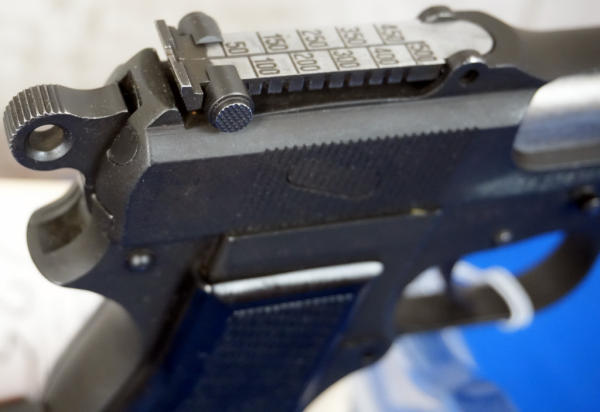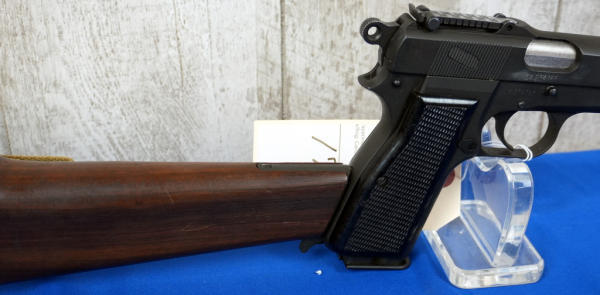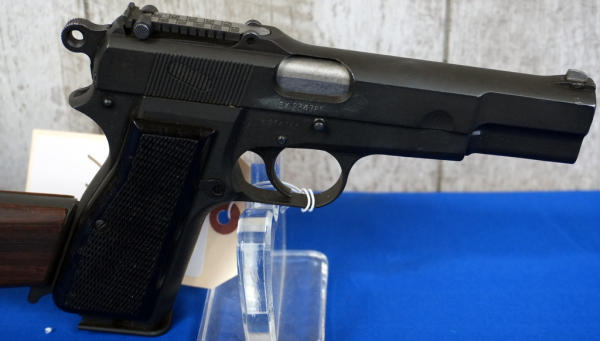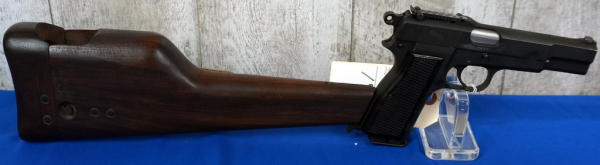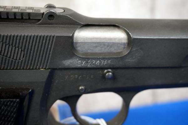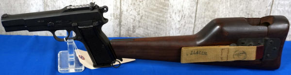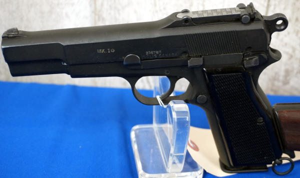 EXPERIMENTAL. 4.75" Stainless Barrel; Canadian broad-arrow marked. JI marked mag, SALtd 1944 holster stock w/ frog, C166; black checkered plastic grips; nice condition; Inglis, Canada; SN#EX234785; A-192