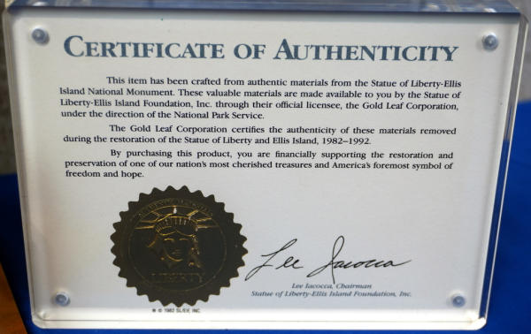 Not from Yuly Estate, lots 195-200 all come from an Estate of a Lawyers office out of Sioux Falls, SD; this comes with a COA; stands 25.5" tall; from 1982-1992 Lee Iacocca was commissioned to restore the actual Statue of Liberty at Ellis Island; some materials were removed during renovation and later melted down to these replicas; 3 sizes were made (this being the middle size); not sure how many were ever produced but numbers were very low and they were hard to get at the time. Very few have ever came to market; amazing piece of history and would look awesome in any collection!