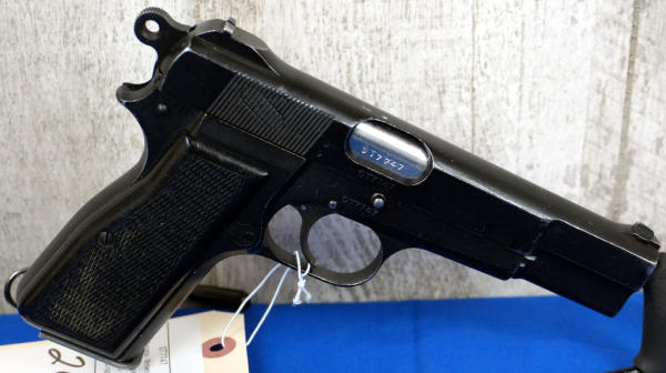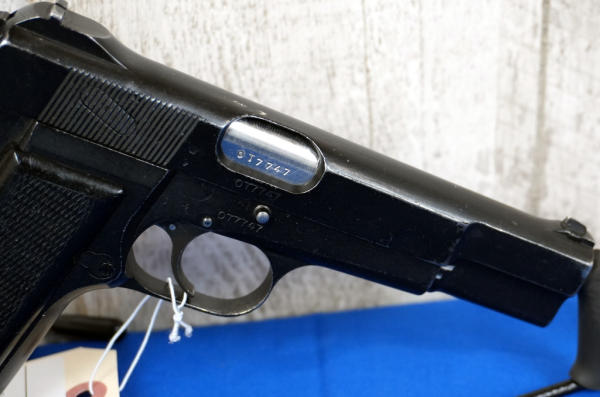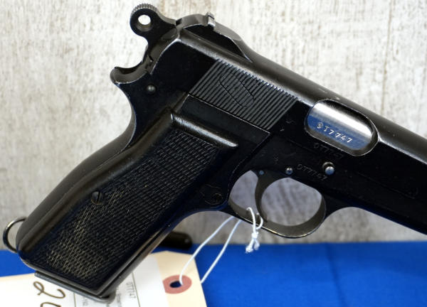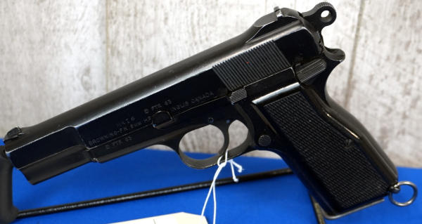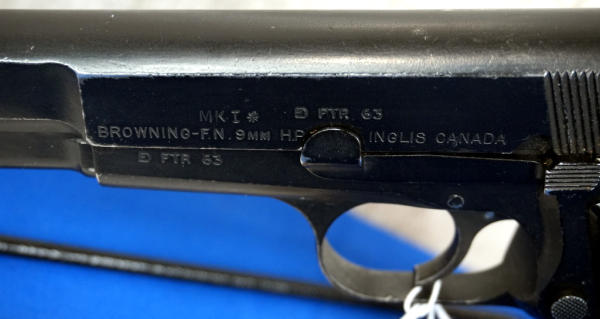 4.75" Stainless barrel; FTR 1963 marked, brushed-on finish, late safety, 1 RA magazine; black bakelite checkered grips; fixed sights; Inglis Canada; SN#0T7747; A-192