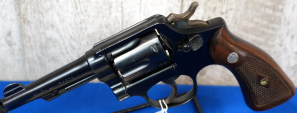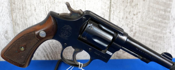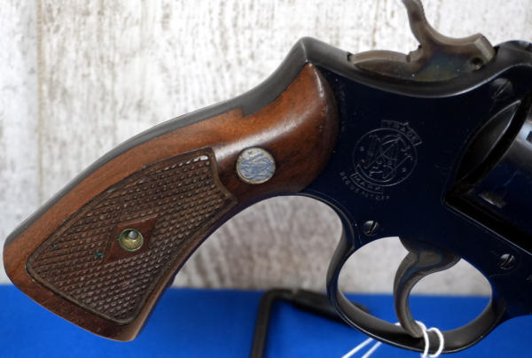 4" BBL; in civlian brown leather holster; wood checkered grips; 6-shot swing out cylinder; nice bluing; USA; SN#C6363; A-192
