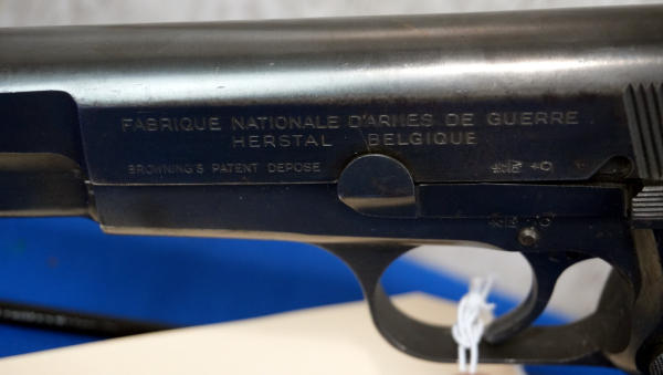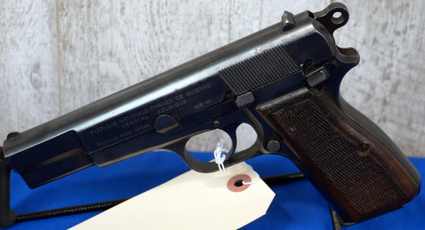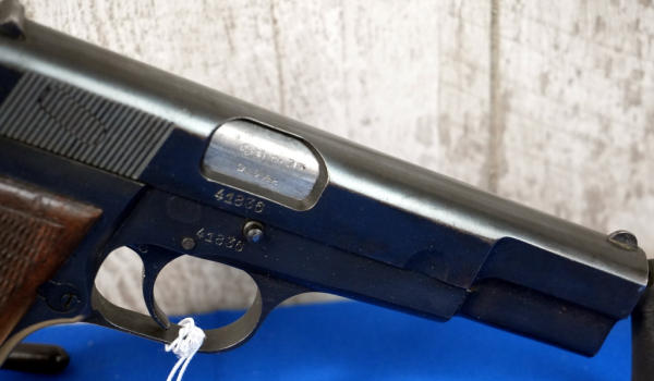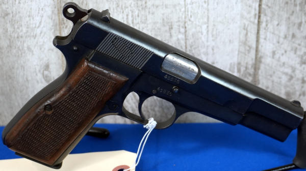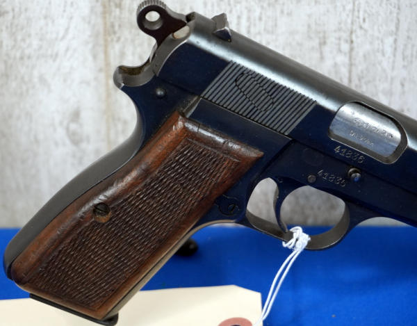 4.75" Stainless Barrel; Belgian proofmarks, fixed sights, red-backed wood checkered grips. SARCO import marked (on frame, below barrel). 1 RA marked magazine; Belgian; SN#41836; A-192