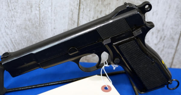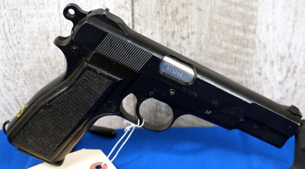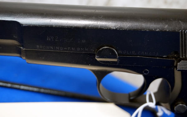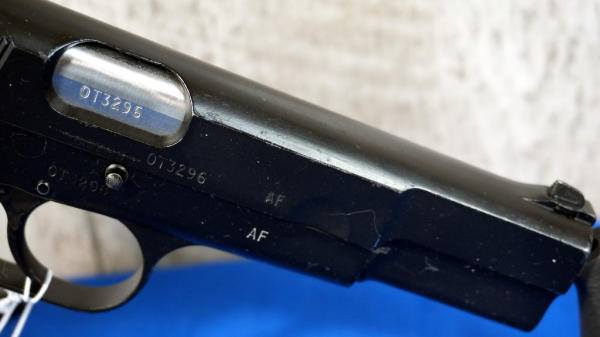 4.75" Stainless barrel; Lanyard loop, 1 RA mag. UK refurbished, forced matching slide. Light importer stamp on LH side of frame over the grip. Rack ID 26 painted on the back of the frame; black plastic checkered grips; Inglis Canada; SN#0T3296; A-192