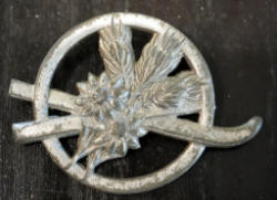 not positive on origin; 1.25" diameter; looks like one of the tips of a ski is broke off