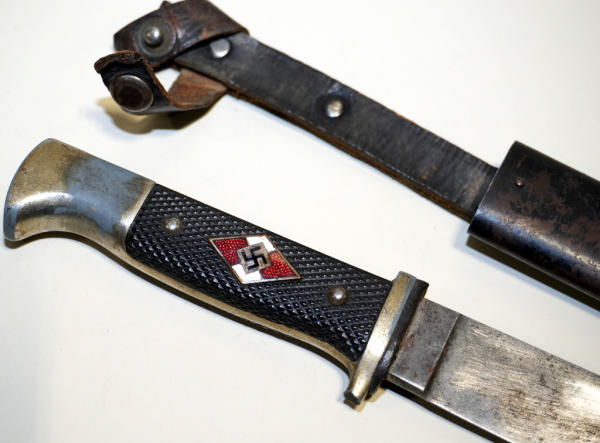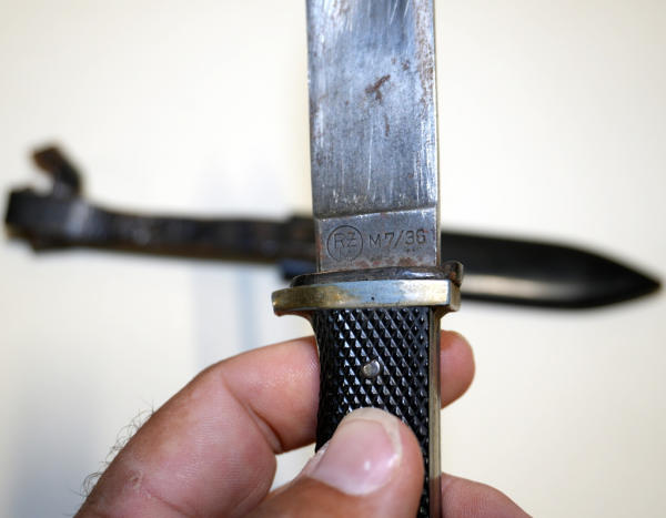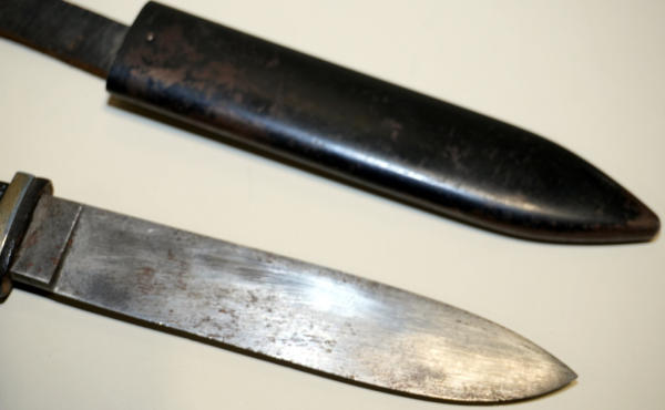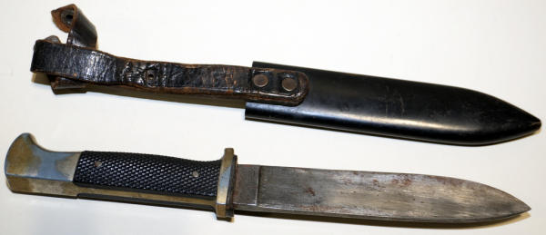 missing the finger guard on handle; plastic checkered grips; metal has wear; blade is 5"; metal sheath w/leather strap;